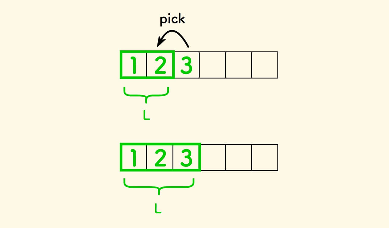 L右边的元素和当前元素互换位置,L向右扩展。左边的元素,已经被