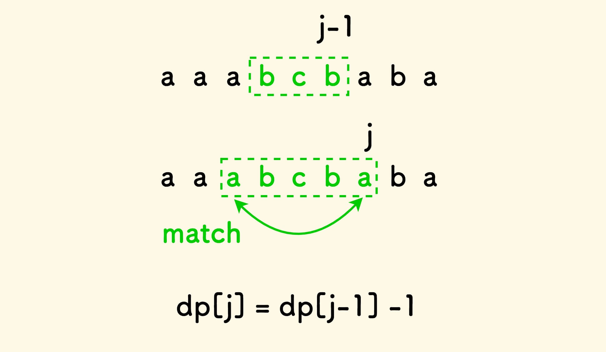 dp[j] = dp[j-1] - 1。此外,由 前面的结论 可知,不会形成比它更长的回文串。