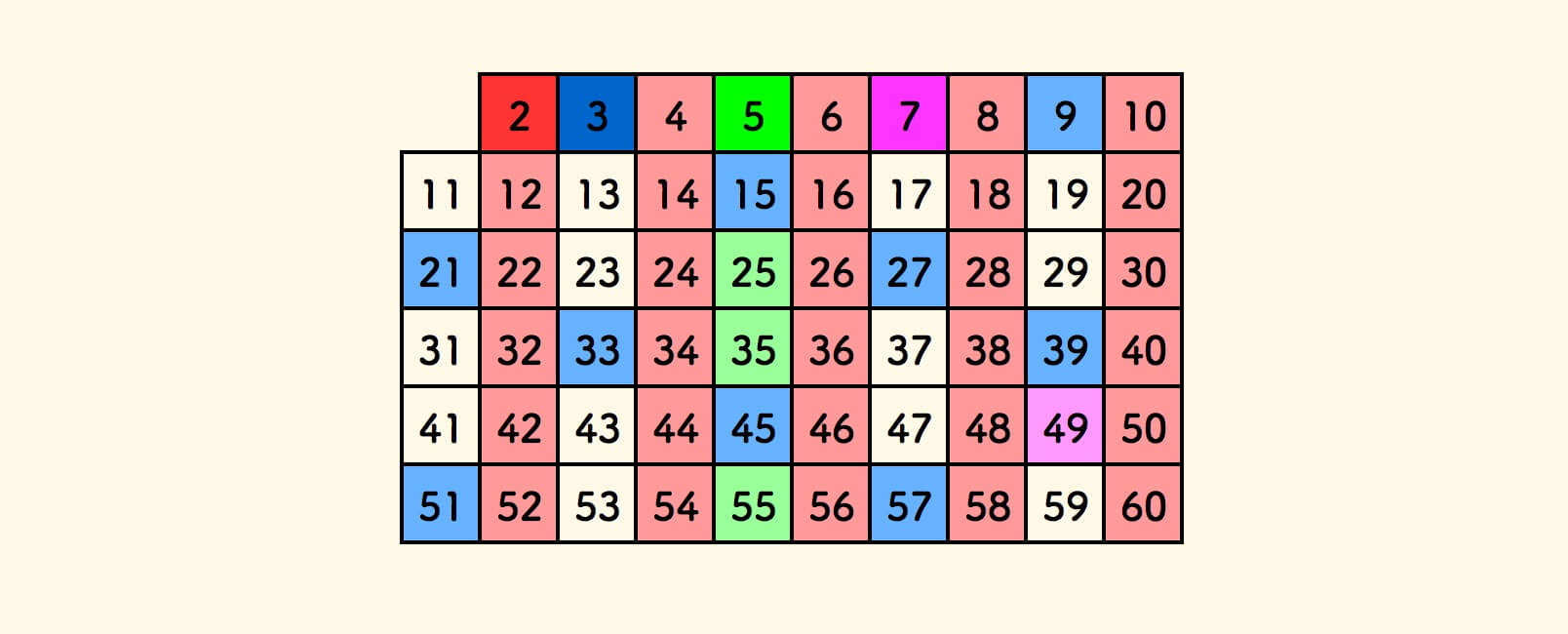 重复如上,直到遍历完表格中的数字,即得到小于 $n$ 的所有素数。