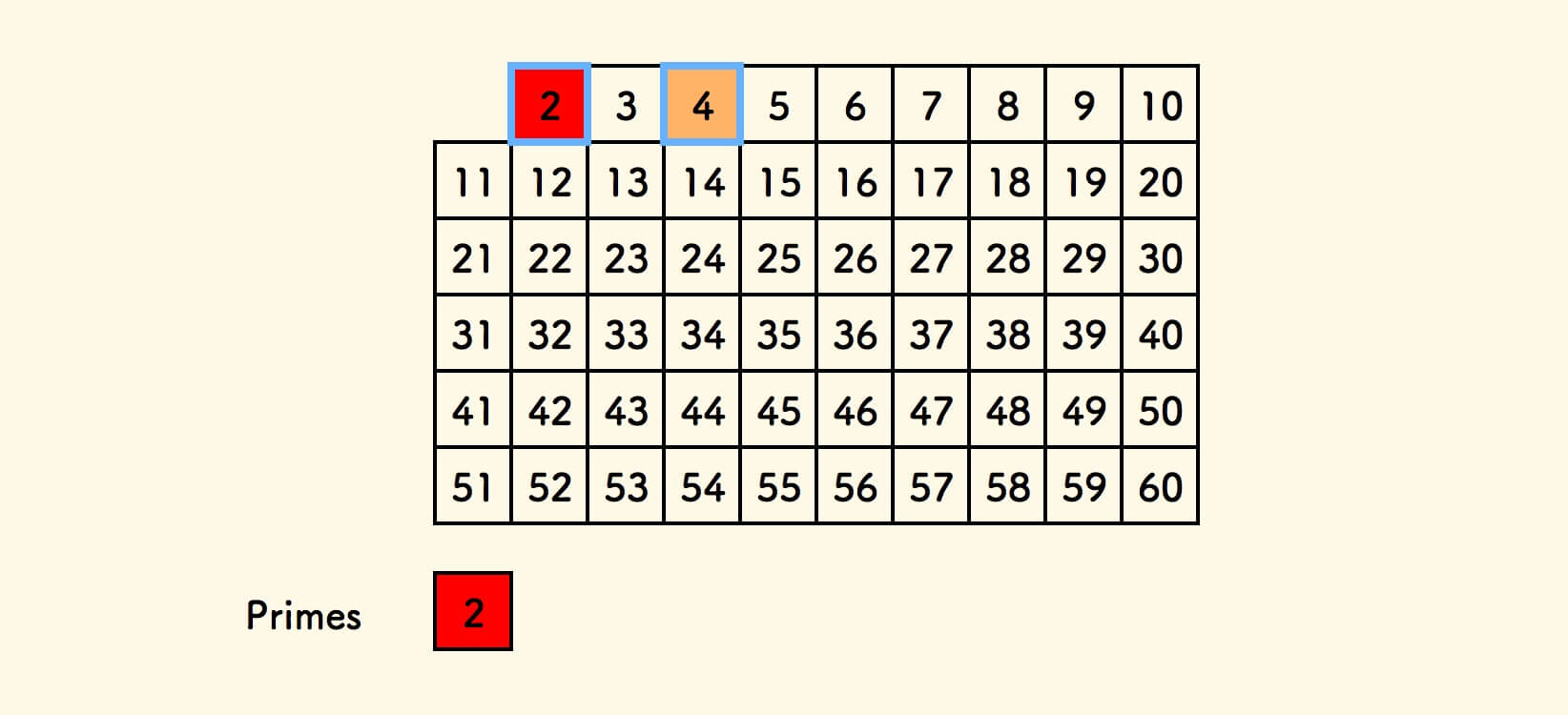 遍历表格中的数字,对于 $2$ ,当前表格中的标记是真,说明是一个素数 。