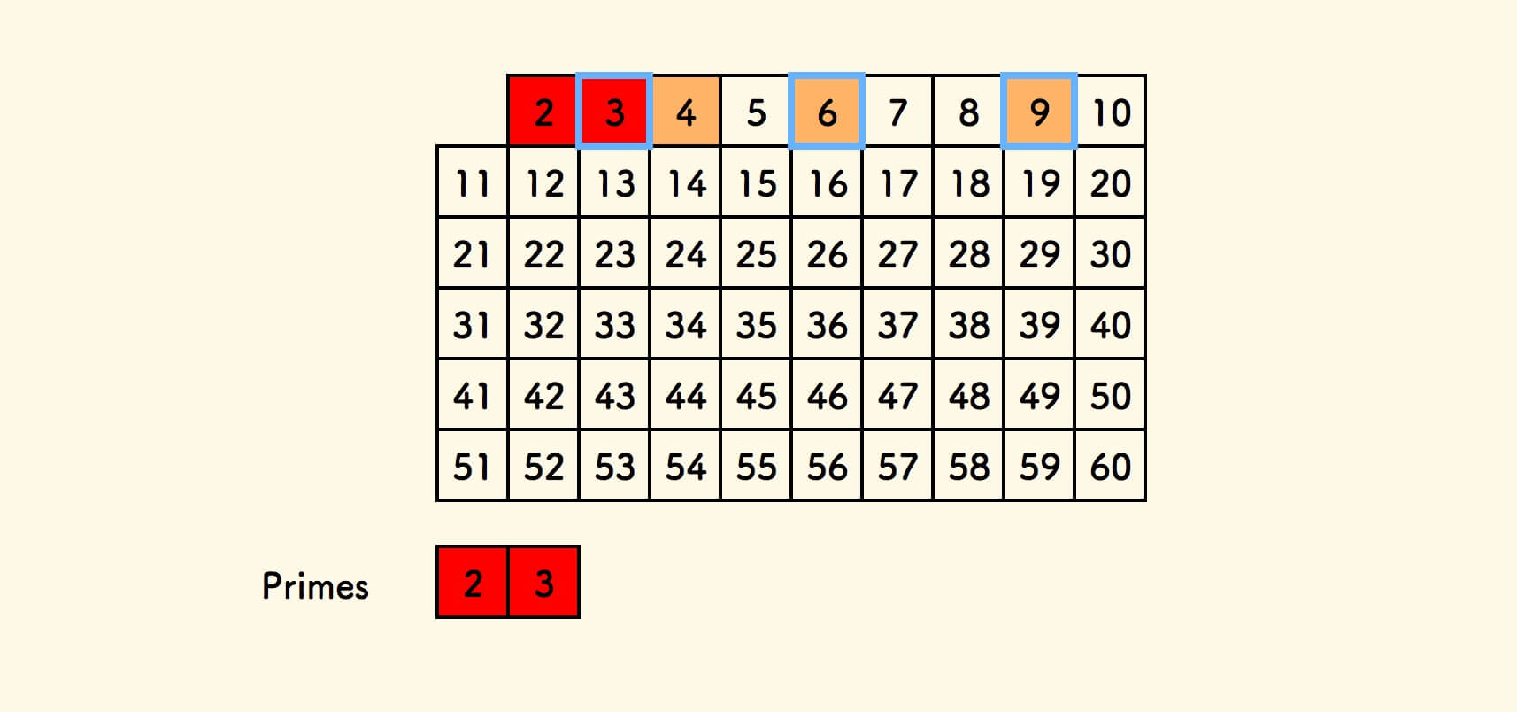 把 $3$ 加入素数数组,筛去 $2 \times 3 = 6$ 、 $3 \times 3 = 9$ 。