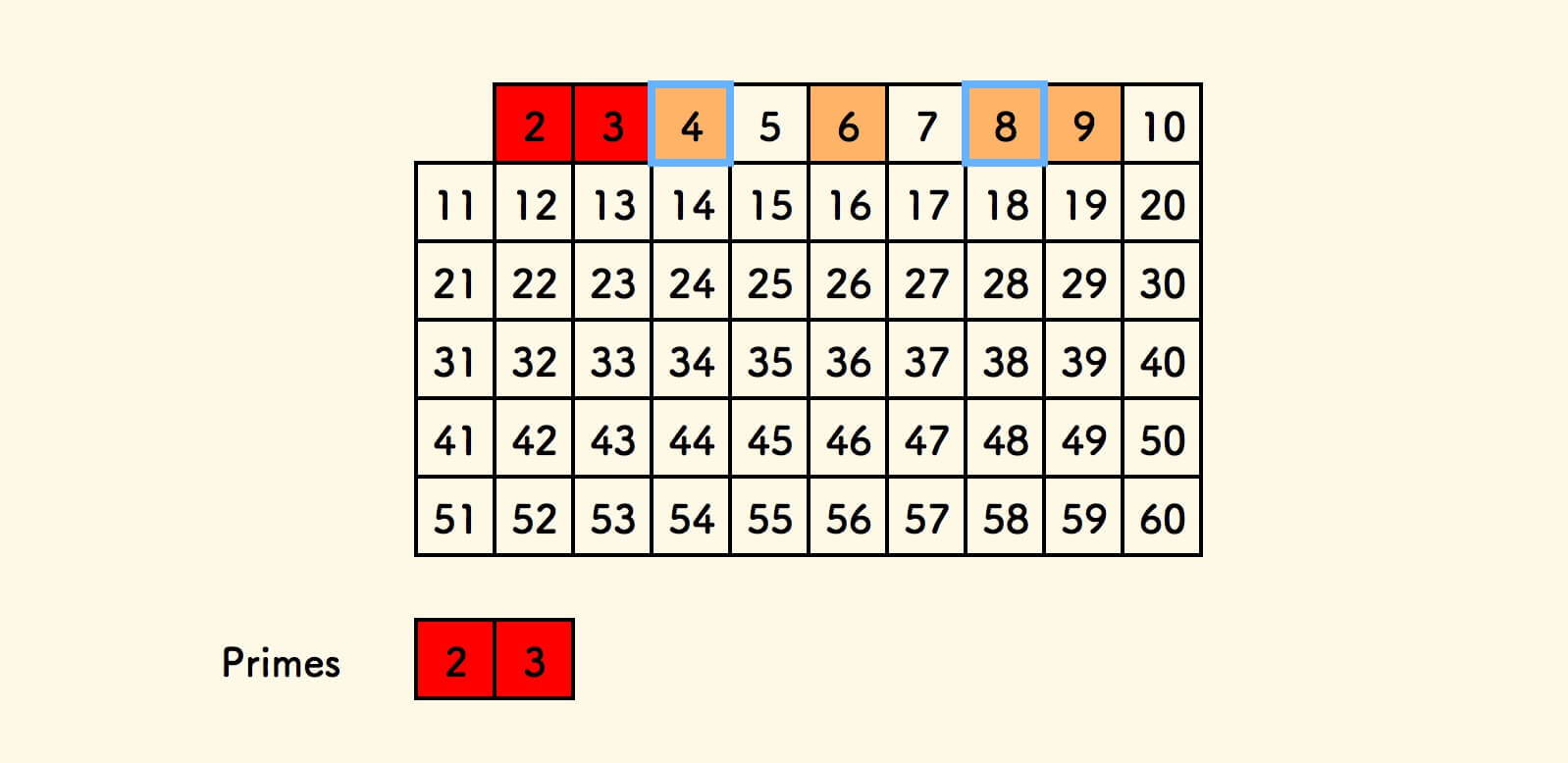 例如,在使用筛子 $3$ 进行合数标记的时候,数字 $12$ 会被重复标记,因为它已经被 $2$ 标记过一次: