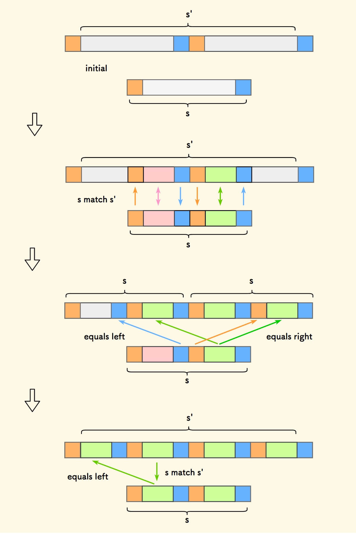一步一步对各部分涂色,使得相等的字符串颜色一样 。