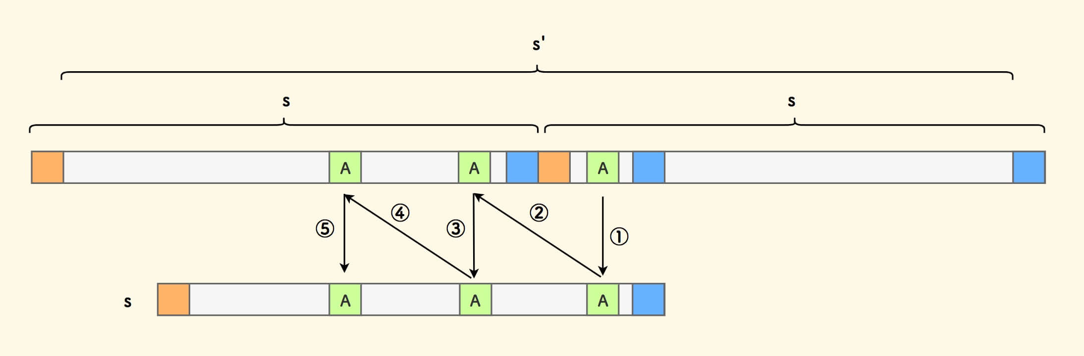 上面推演中的一个细节是,无法推演小份串的倒数第一个字符。