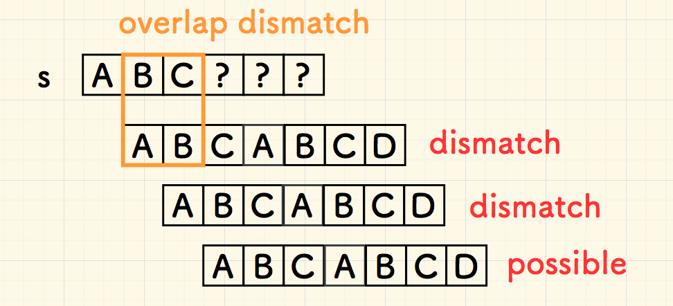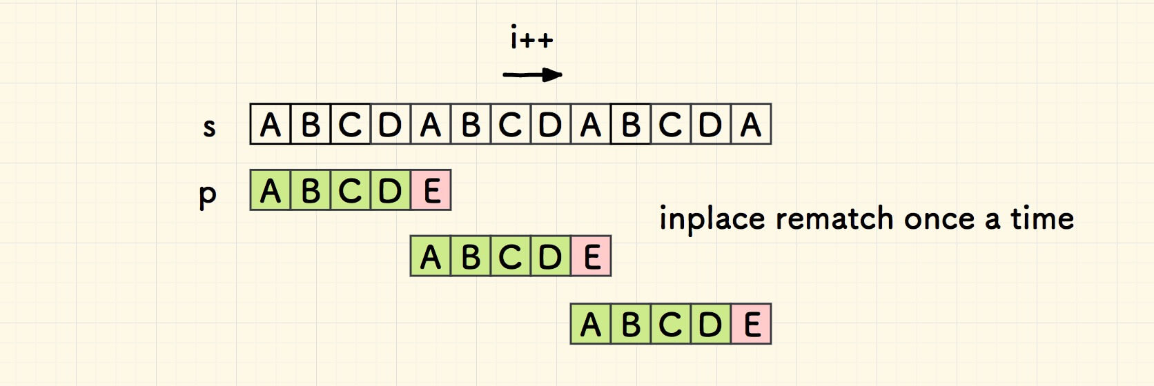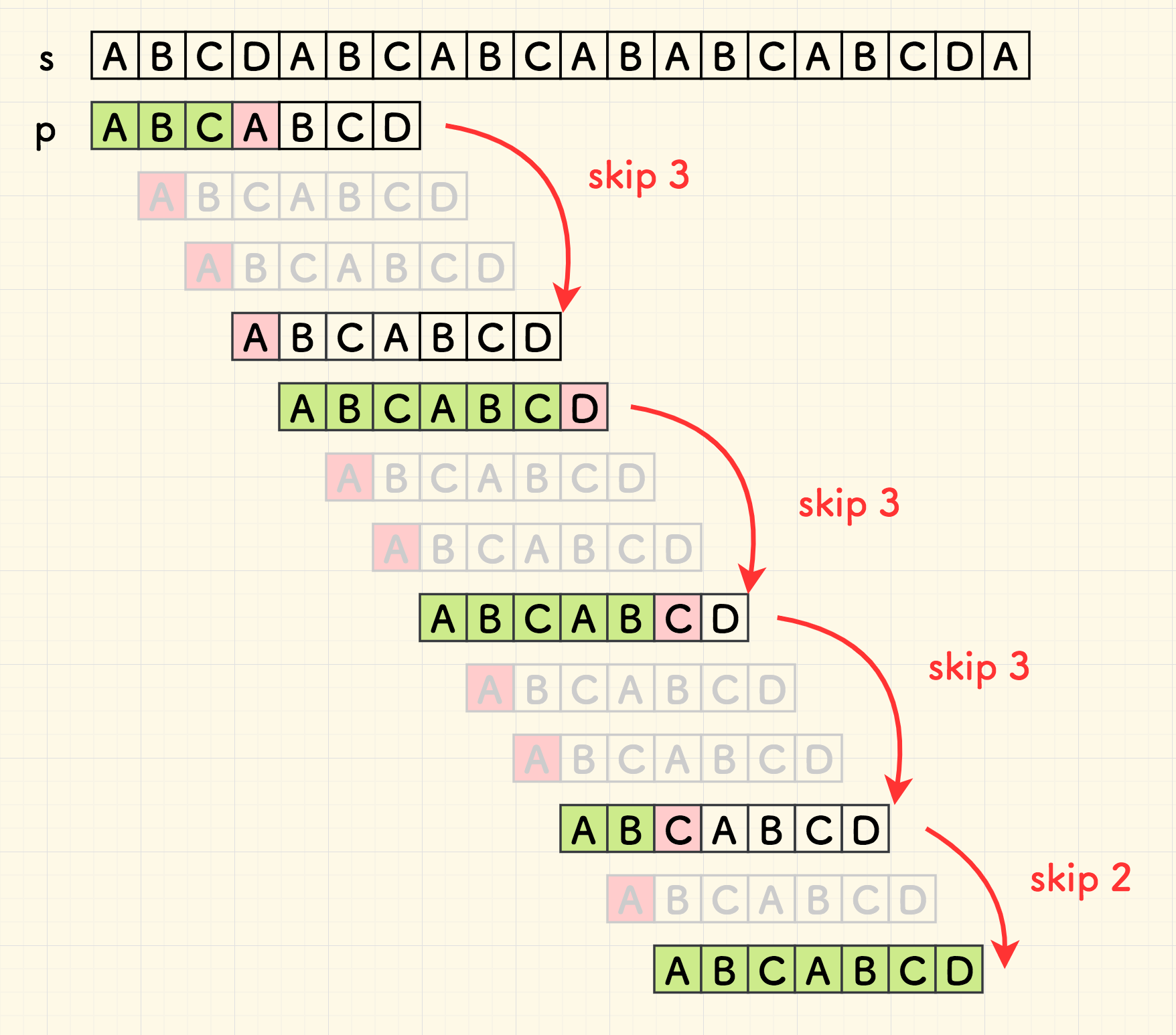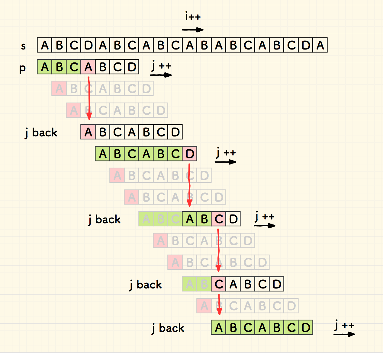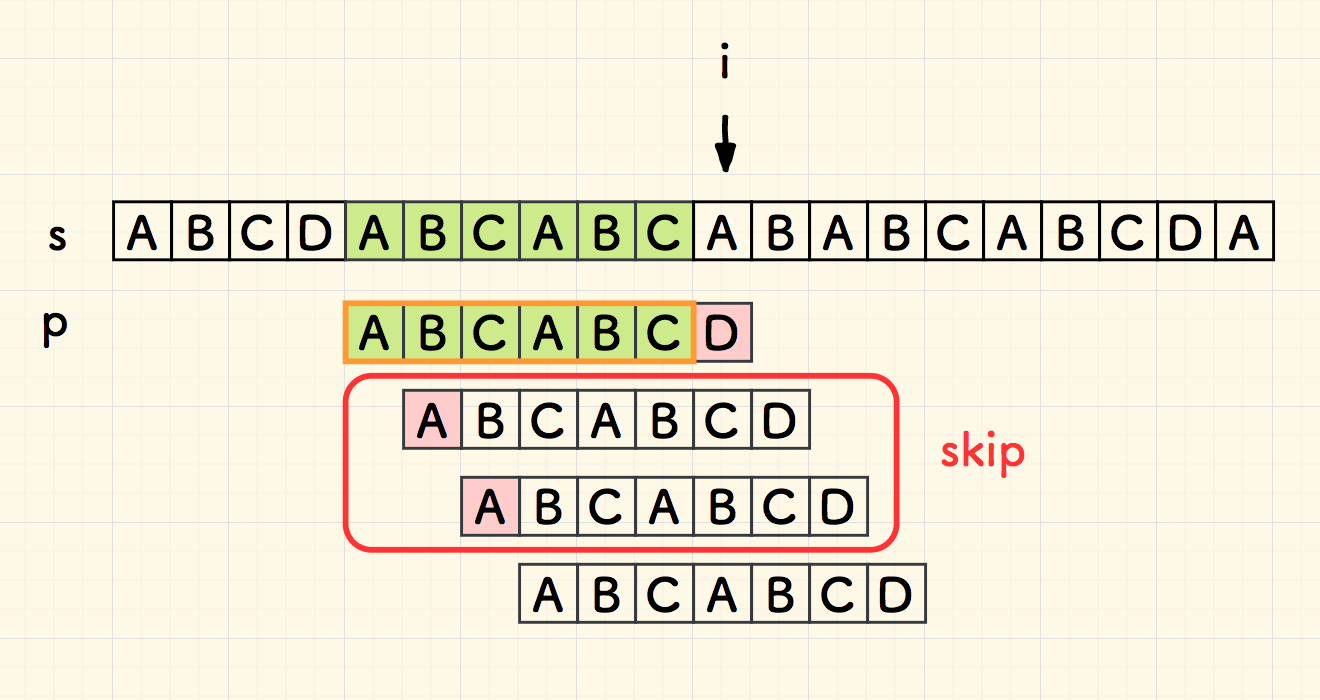 如此,最终的算法过程则是下图的样子,可以看到,主串 s