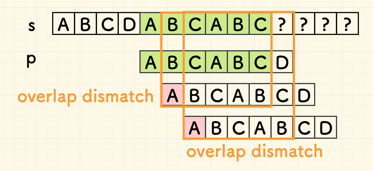 考虑第一次失配的状态,如下图 1.2 所示,此时绿色的部分是目前匹配成功的部分。