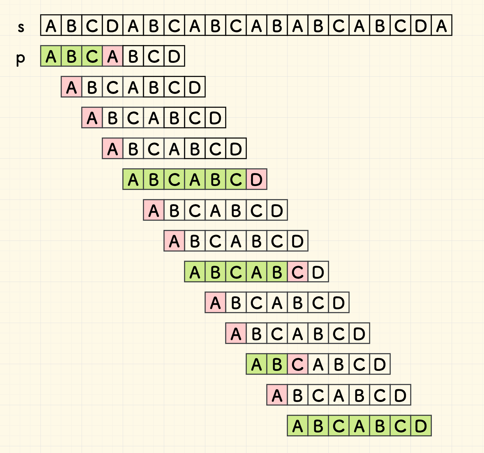 将上面简单匹配的过程展开,如下图 1.1 所示,其中绿色的部分表示字符比对成功,红色表示比对失败 。 图中每一次比对,都会将子串 p