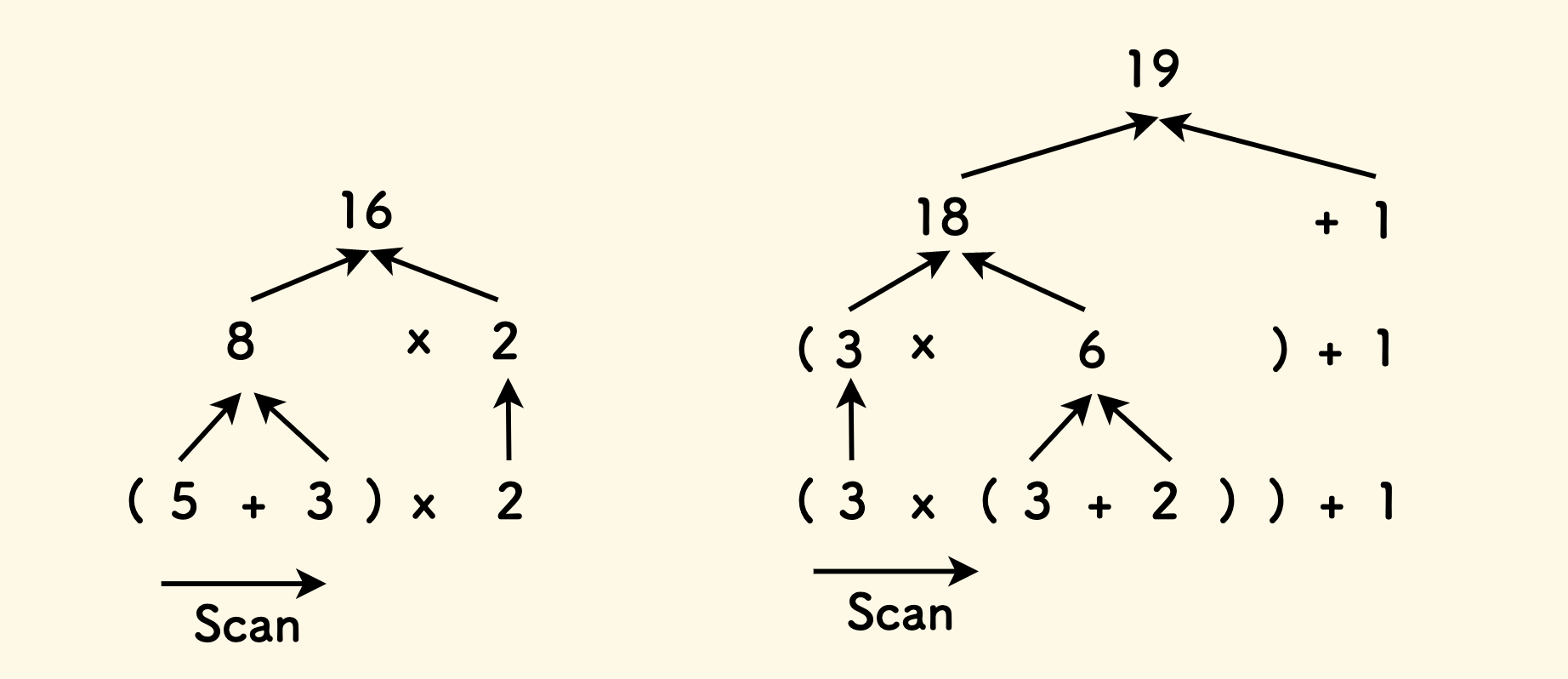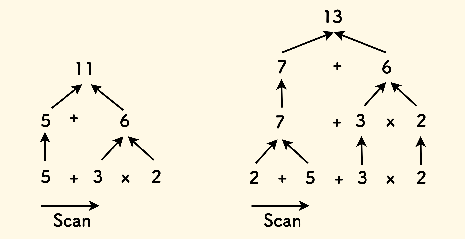 事实上,前面的两张示意图,已经暗示了,算术表达式求值可以表达为一个自底向上的过程。