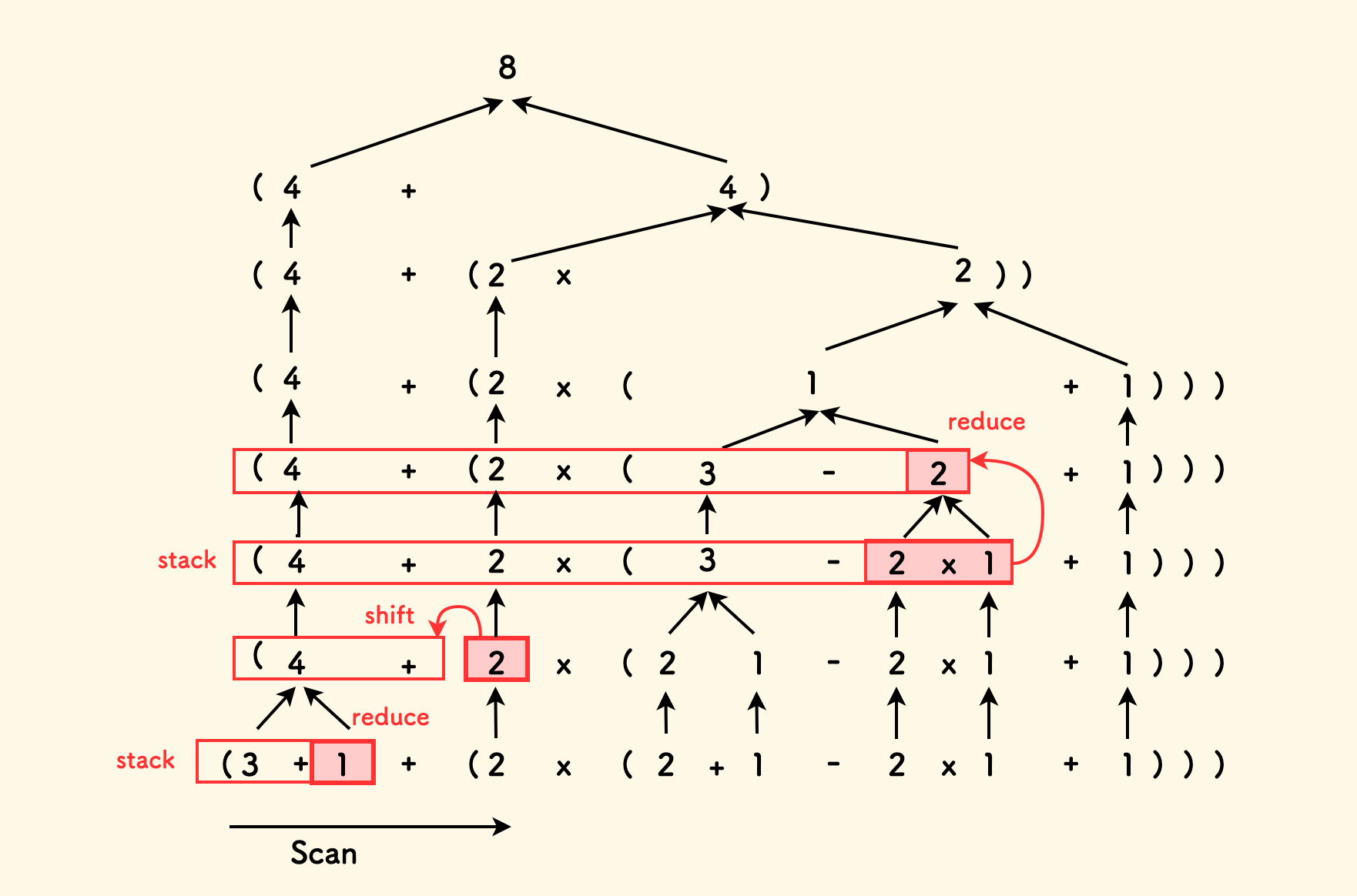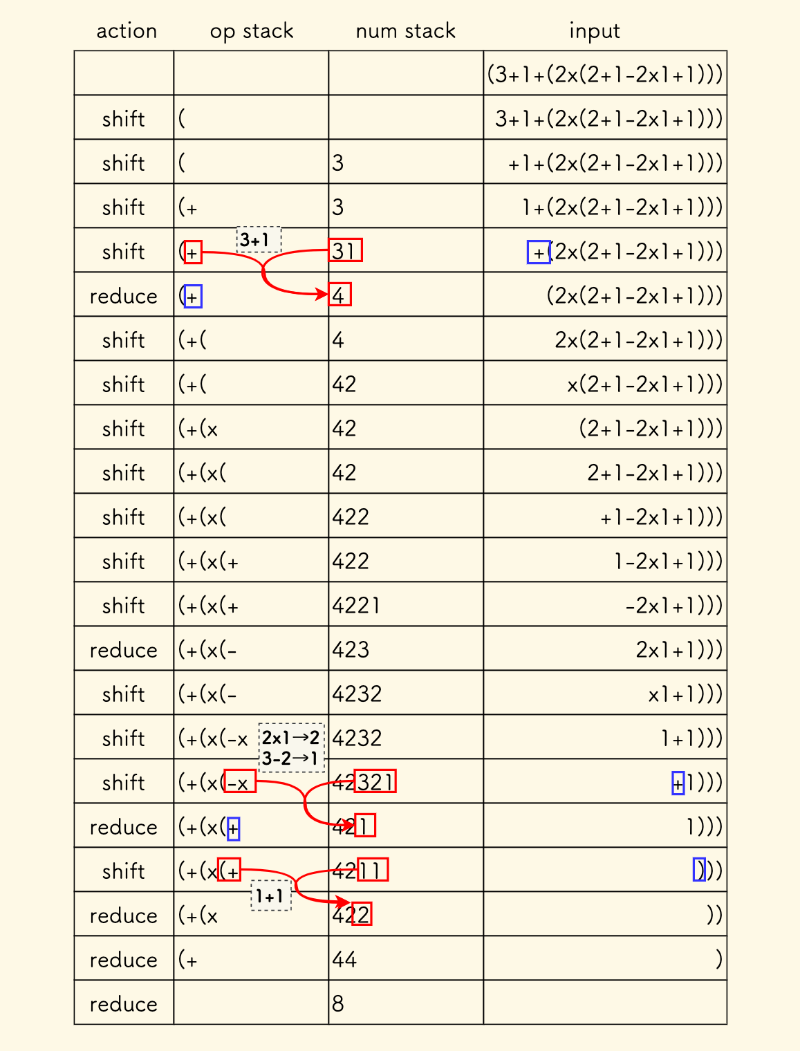 实际上也是一种 shift-reduce 移入归约 过程: 所谓「shift 移入」是指输入符号入栈,「reduce 归约」是指 符号出栈计算、结果再入栈。