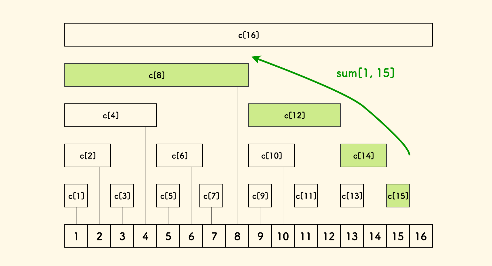 sum[1, 15] = sum[15, 15] + sum[13, 14] + sum[9, 12] + sum[1, 8]