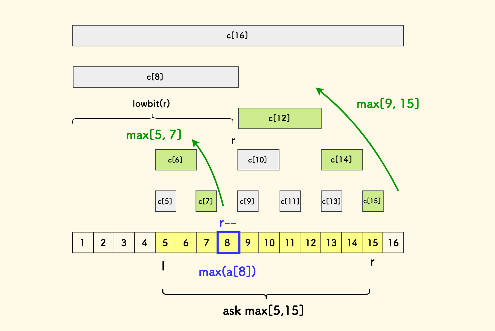 (说明见图下方)。 - 上面一层管辖的区间是当前层的二倍长。