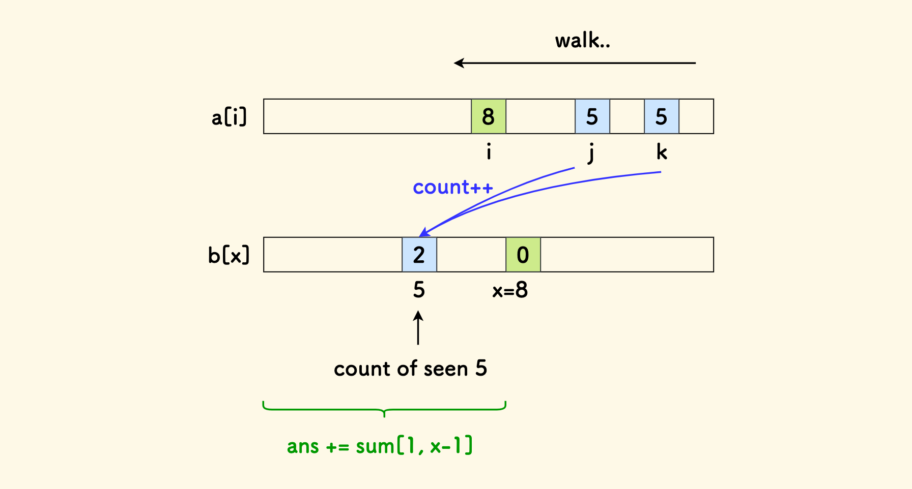 int aq[n+1]; // 维护 a[i] 右边有多少比它大的元素 for (int i = n; i >= 1; i--) { aq[i] = query(a[i]+1, N); // N 是 a[i] 的最大值 add(a[i], 1); }