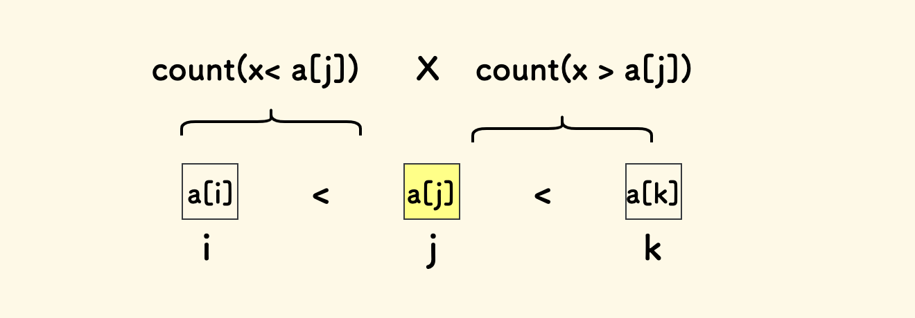 ,固定好它之后,它能形成的三元上升序列的个数,应该是左边比它小的元素个数乘上右边比它大的元素的个数。
