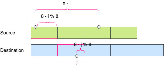 新算法的第一步,是要先通过老的算法的方式,到达下面图示的状态,这个状态下,目标串的起始比特索引值处于字节的 0 bit