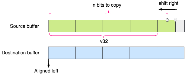 的整数倍。 这一过程可以复用当前的字节内拷贝比特的逻辑。 这个过程几乎一次到两次就可以把目标串进行对齐。 - 对齐后,当剩余需要拷贝的比特数量比较多的时候,把源数据用整型读出,进行右移操作后,直接进行逐字节复制。