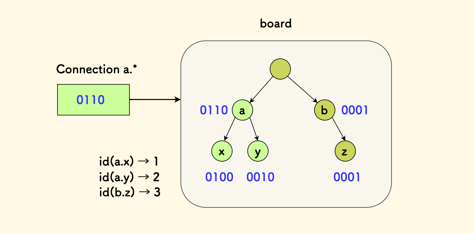 虽然我们是用前缀树来匹配信号的,但是这种匹配只发生在预先的绑定阶段,在信号生产和消费的运行时阶段,分发是按基于 bitset