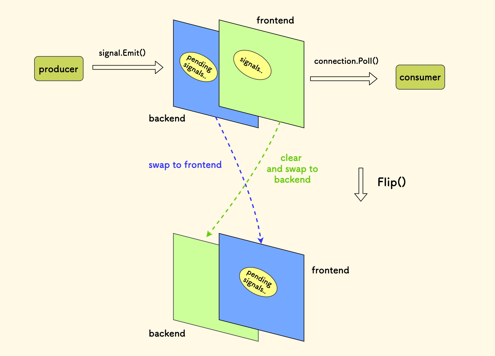 - 后端 buffer 主要记录生产者释放的信号内容,面向生产者