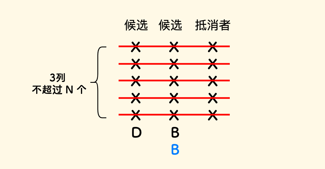 和 N/2 的情况不同的是,现在是两个候选人, 而且投票抵消的规则有所变化。