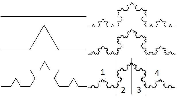 科赫曲线 是一种分形结构: 将各边分成3等份,不断重复这个过程。
