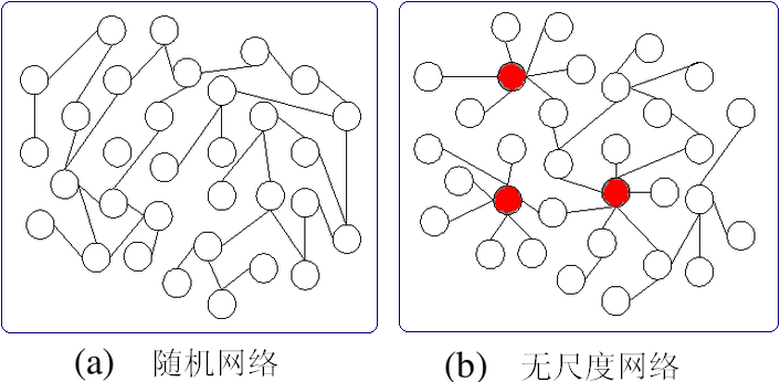 下图a是随机网络的度分布,b是无尺度网络的度分布,可以看出b是符合幂律分布的,幂律分布本身也是无尺度的,具有标度不变性。