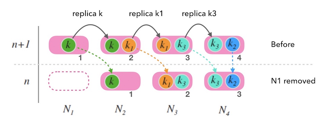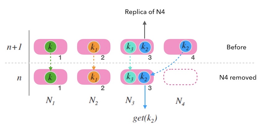 假如移除最后一个节点, 如下图10.2中, 尾部节点 $N_4$ 被移除后, 整体映射情况和节点数为 $n$ 的时候是一致的。 一切看上去还好。 只要考虑如何备份 $N_4$ 上的数据就可以了。 参考上面如何扩容的玩法,可以把尾部节点的数据备份到老节点 (例如,图10.2中 $k_2$ 的老节点就是 $N_3$)。