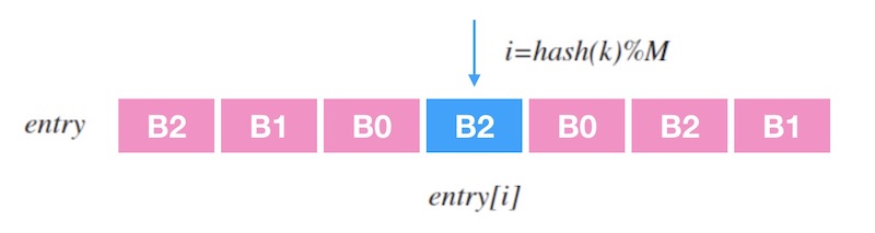 还有一个问题没有解决:偏好序列是怎么生成的? 取两个无关的哈希函数 $h_1$ 和 $h_2$, 假设一个槽位的名字是 $b$, 先用这两个哈希函数算出一个 $offset$ 和 $skip$