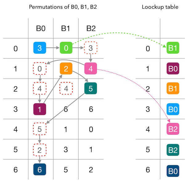 \[offset = h_1(b) \% M \\ skip = h_2(b) \% (M - 1) + 1\]然后, 对每个 $j$,计算出 $permutation$ 中的所有数字, 即为槽位 $b$ 生成了一个偏好序列:
