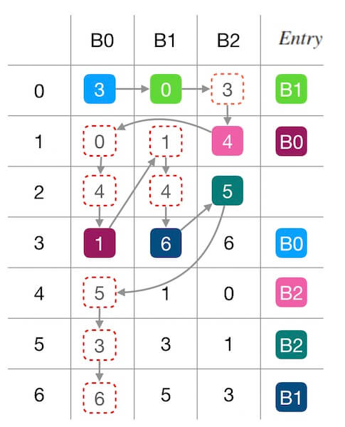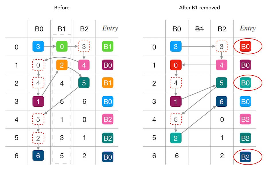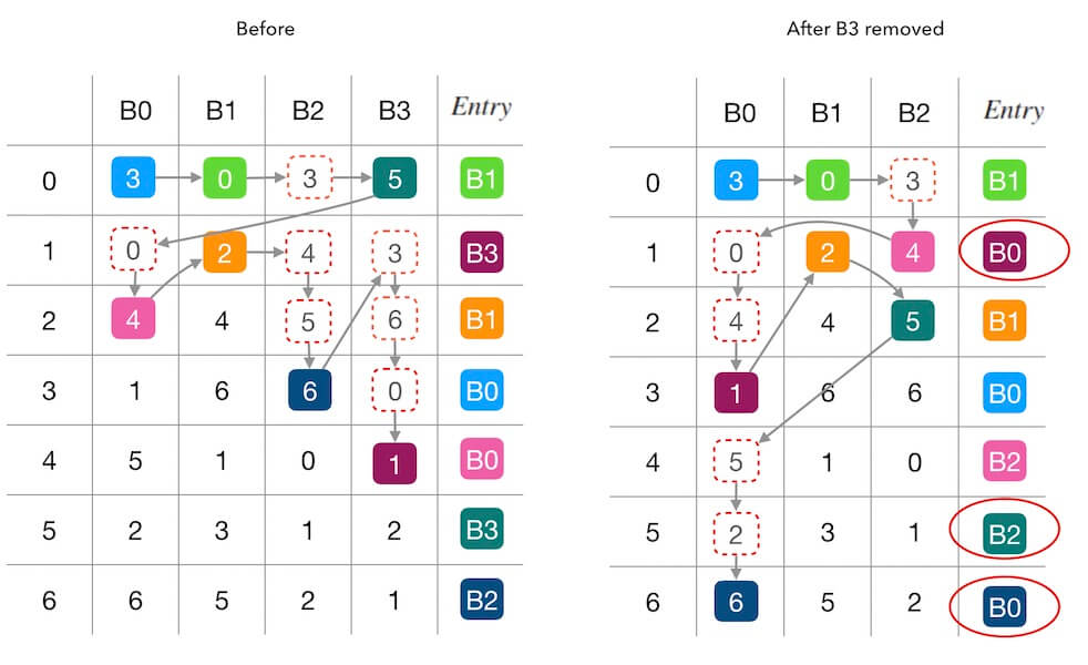 下面的图2.1中演示了删除槽位 $B_1$ 前后的填表情况。 红色圆圈内标出了受干扰的填表结果, 可以看到,查找表7个位置中有3个被重新填充。 其中两个位置(第 $0$,$2$行)是因为 $B_1$ 的移除导致被其他槽位接管, 还有一个第 $6$ 行的 $B_0 \rightarrow B_2$ 的联动干扰 (因为 $B_0$ 接管了 $B_1$ 的 $entry\left[2\right]$ 导致原本自己的 $entry\left[6\right]$ 被 $B_2$ 抢占)。