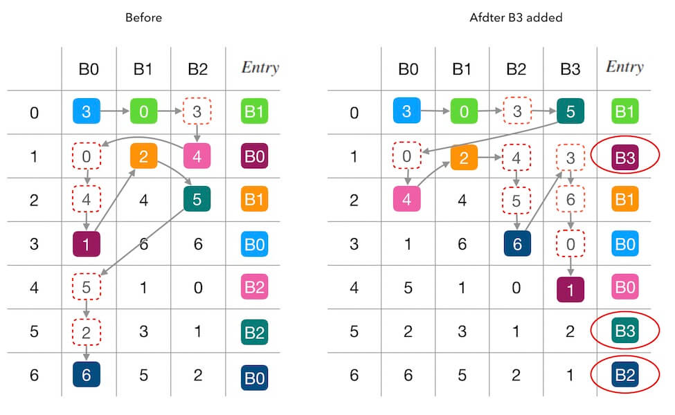 下面的图2.2中演示了新增槽位 $B_3$ 前后的填表情况。 同样,红色圆圈内标记了受干扰的填表结果, 可以看到,7个位置中有3个被重新填充。 其中两个位置(第 $1$,$5$行)是因为 $B_3$ 的加入抢占了其他槽位的填充机会, 另一个第 $6$ 行的 $B_0 \rightarrow B_2$ 则是一种联动干扰。