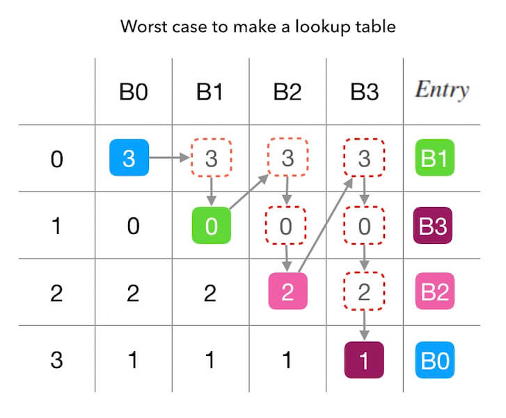 - 如上面的玩法, 直到把整张查找表填充满。