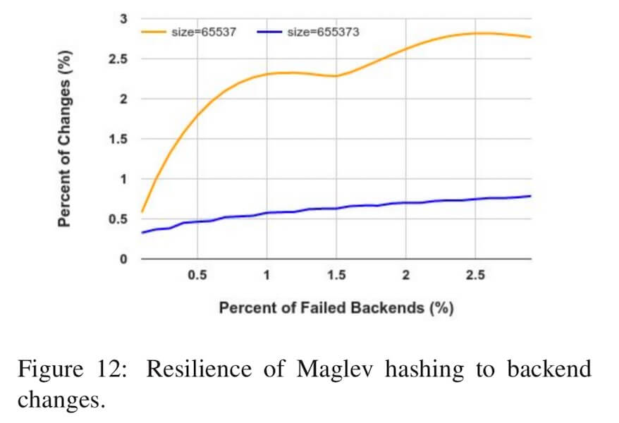关于槽位增删对映射一致性的干扰影响,由于哈希环算法实现了最小的重新映射, 所以当删除槽位时(比如节点故障时)哈希环算法可以保证剩余的槽位的映射不受影响。 而我们前面有分析,对于Maglev算法来讲, 则并没有做到最小的重新映射。 下面的图4.2中是 Google 对Maglev负载均衡器做的测试结果, 演示了在相同数量的后端节点、但是不同大小的查找表的情况下(分别是 $65537$ 和 $655373$), 映射结果发生变化的节点的占比相对于节点故障占比的关系。 可以看到,查找表越大,Maglev哈希对槽位增删的容忍能力更强,映射干扰也越小。
