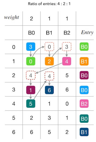 Maglev哈希做到了尽量平均的映射分布,但是,如果槽位之间不是平权的呢? 关于带权重的Maglev哈希,论文中只提了一句话: