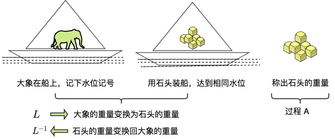 作者以 曹冲称象 的历史故事作为共轭控制的一个例子: 把大象的重量变换成石头的重量的变换视作 $L$ , 称出石头的重量的过程是 $A$ , 最后把石头的重量变换成为大象的重量视作 $L^{-1}$ 。