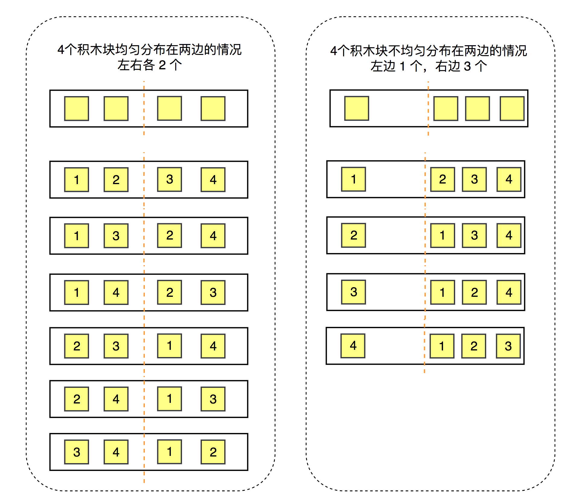 - 情况 2 : 盒子左边一个积木,右边三个积木的情况 (共有 4 个可能)
