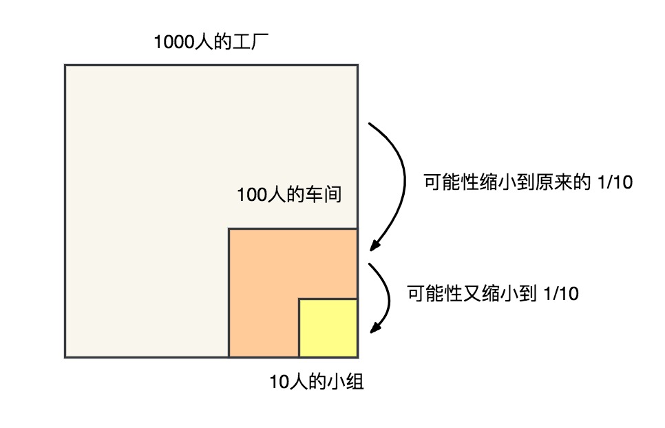 两句话总下来,可能性空间的减少就是 $\frac {1} {10} \times \frac {1} {10}$ , 即 $\frac {1} {100}$。