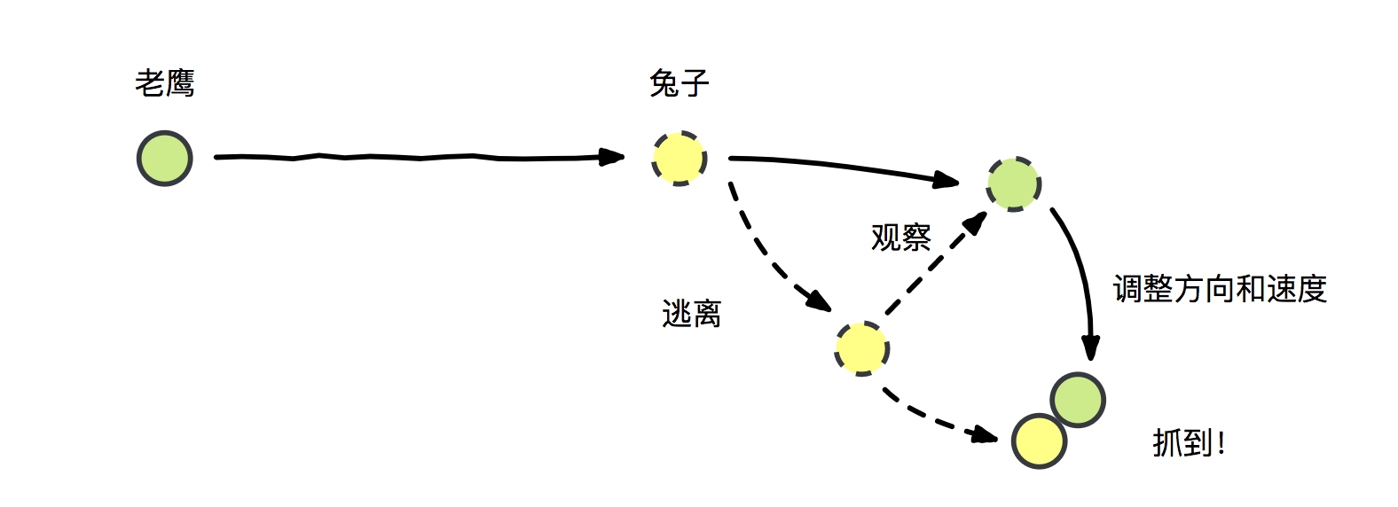 另一个则是采用了负反馈控制的例子,”老鹰抓兔子”, 老鹰会不断根据兔子的位置变化,来调整自己追击的速度和方向,这样更容易命中目标。