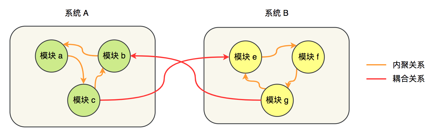 这一点非常像软件构建中的 「高内聚、低耦合」 的思想。下面的图示中,系统间的关系线代表着系统间的耦合, 系统内模块间的线代表着系统内的聚合。