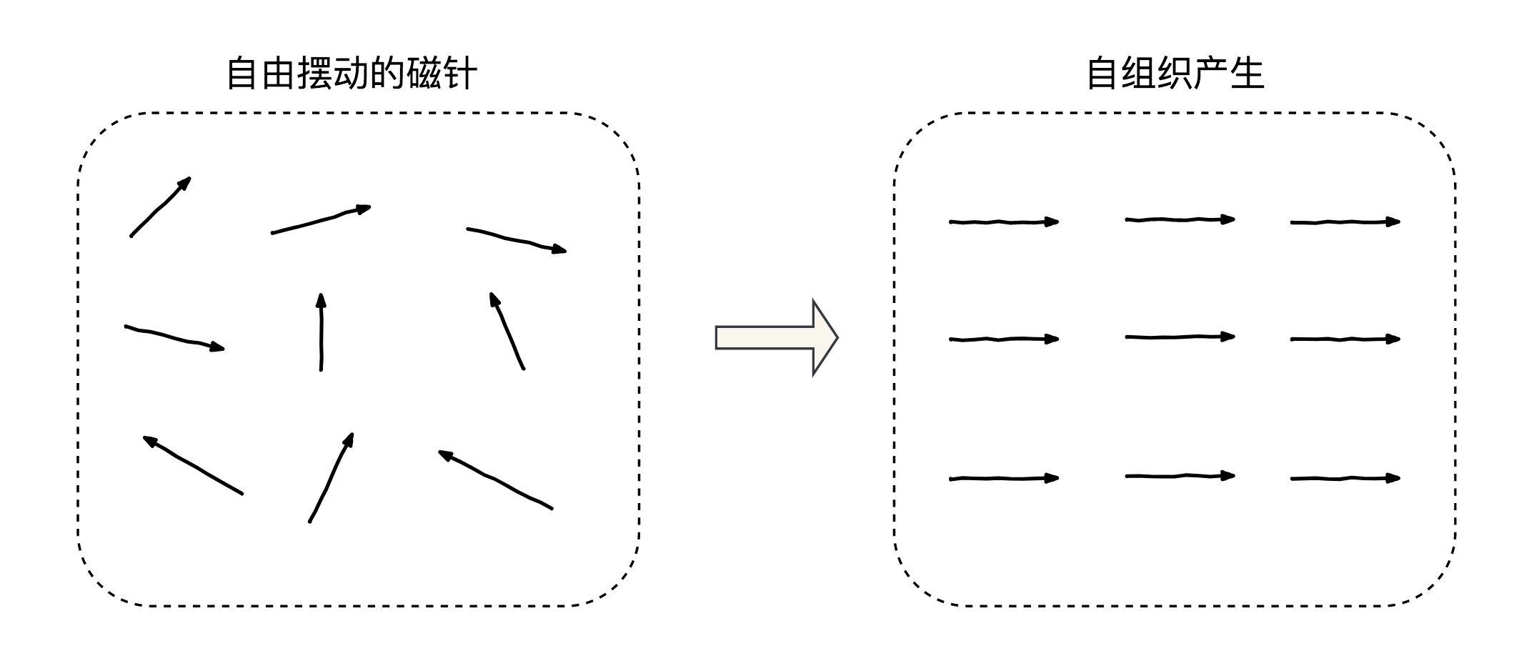 作者在书中举了一个非常有趣的自组织的例子:如果地球磁场和其他磁场不存在,考虑一批磁针,它们最开始的指向都是混轮的, 并且可以自由地来回摆动,但是慢慢地,由于在自由摆动过程中,某些磁针可能指向偶然地一致,于是就会形成「小团体磁场」 ,于是最后所有的磁针都指向一样的方向。