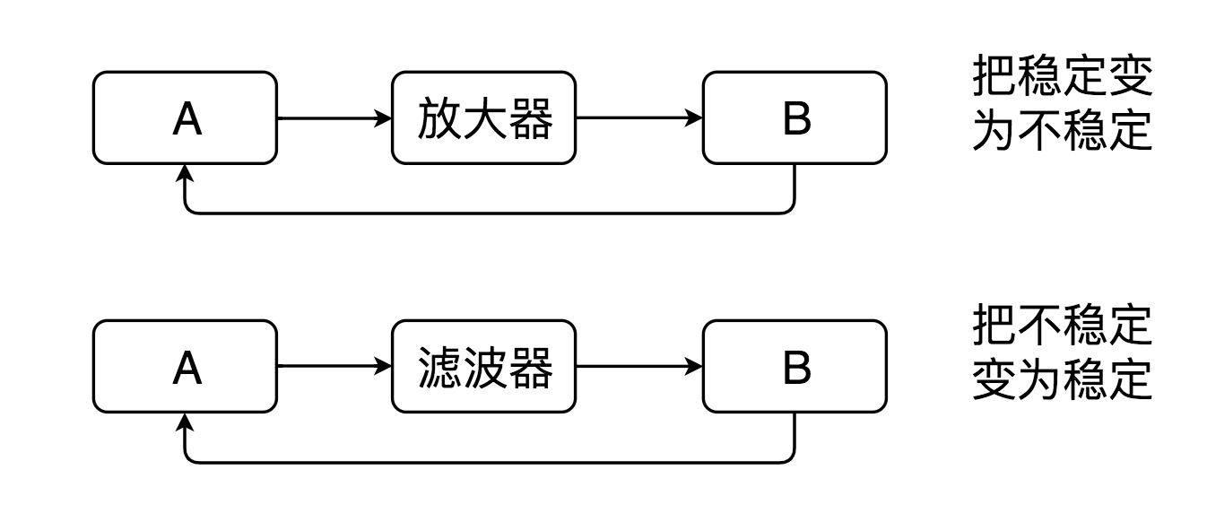 子系统以正反馈这种方式相互作用,就会使系统不稳定,而负反馈则是使系统趋向稳定的作用方式。 通常,在一个反馈回路中,加一个「放大器」,在一定条件下可以将原来趋于稳定的相互作用作用变成不稳定的, 而在反馈回路中加一个滤波器,则可以使原来不稳定的相互作用变成稳定的。