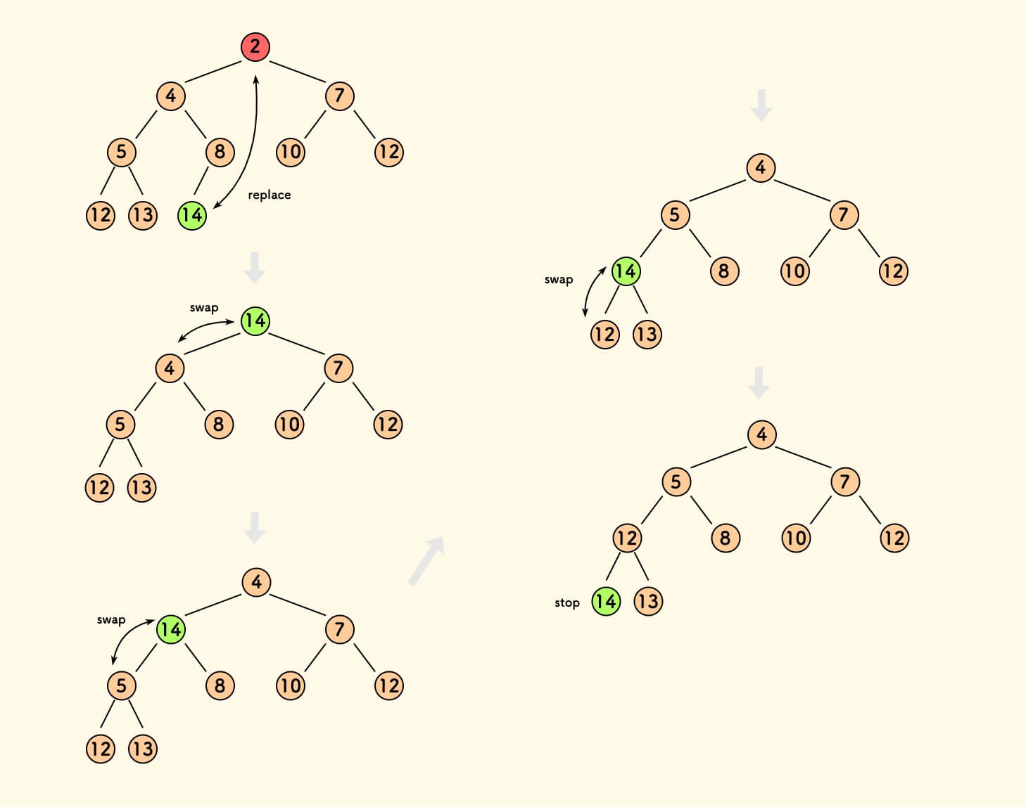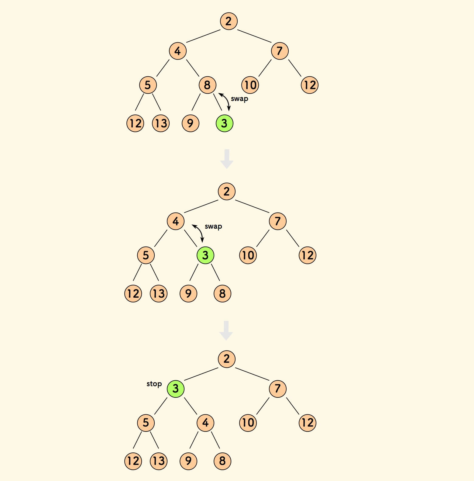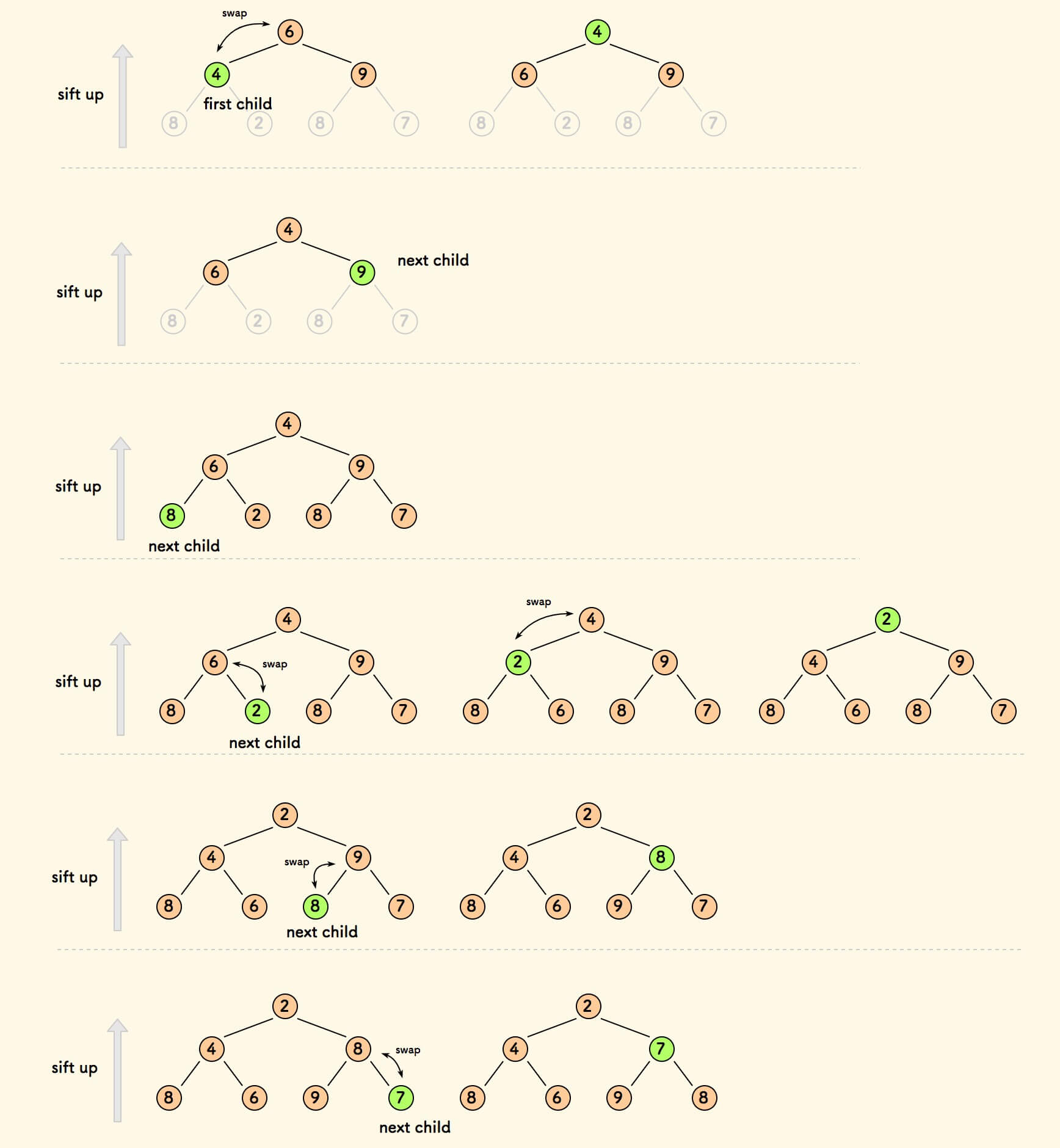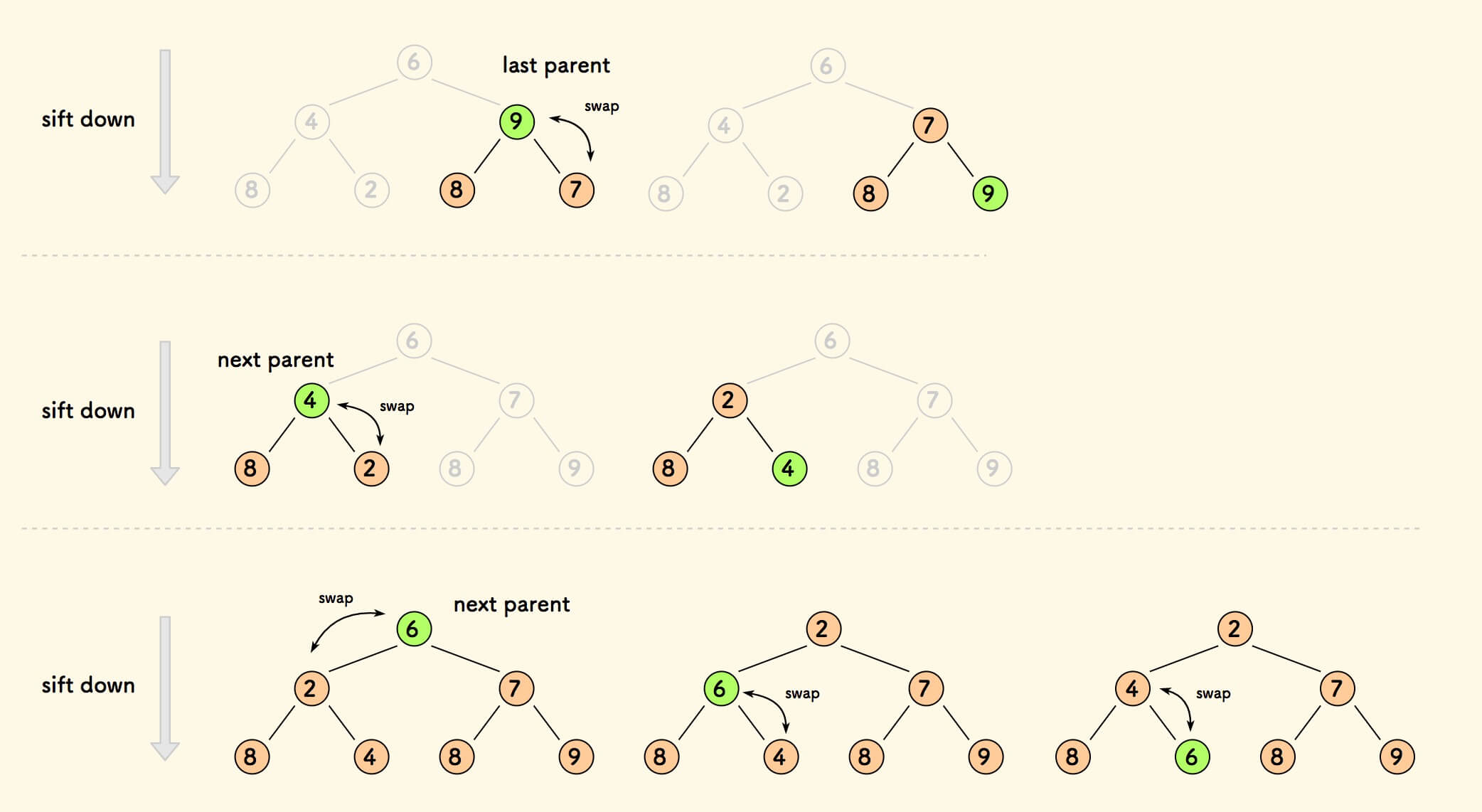 - 如果它比两个孩子节点的值都小,则和更小的孩子交换。