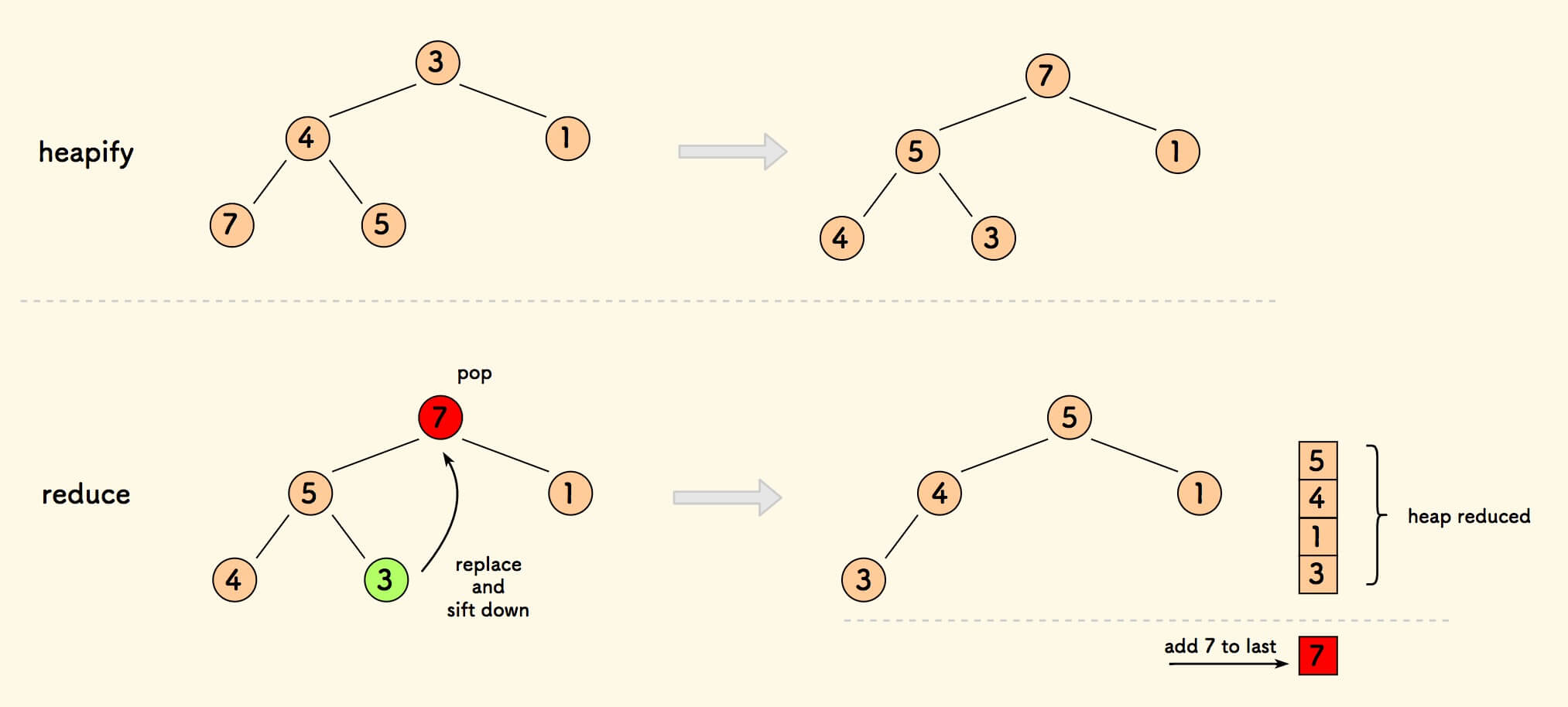 原地堆排序的方式,亦可以使用最小堆,排完后,元素是从大到小有序的,需要原地反转才可以变成从小到大有序。