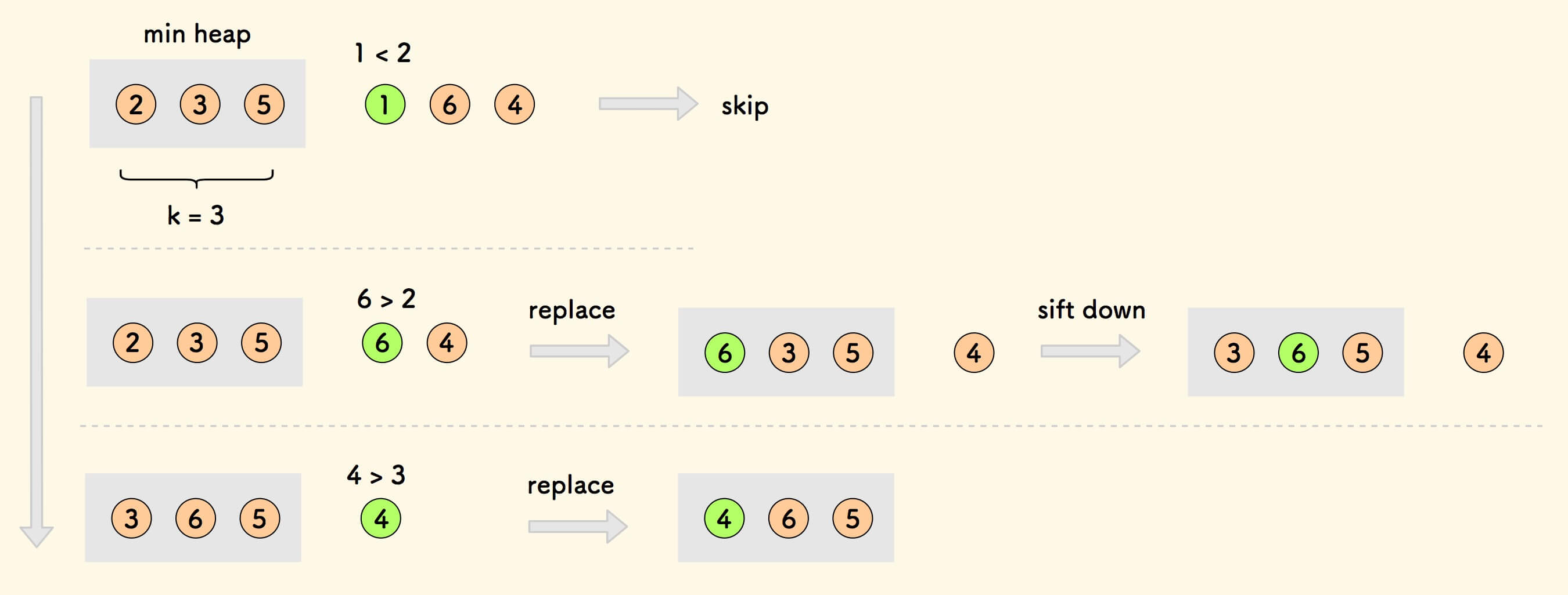 // 剩余的 k .. n-1 元素依次和堆顶比较