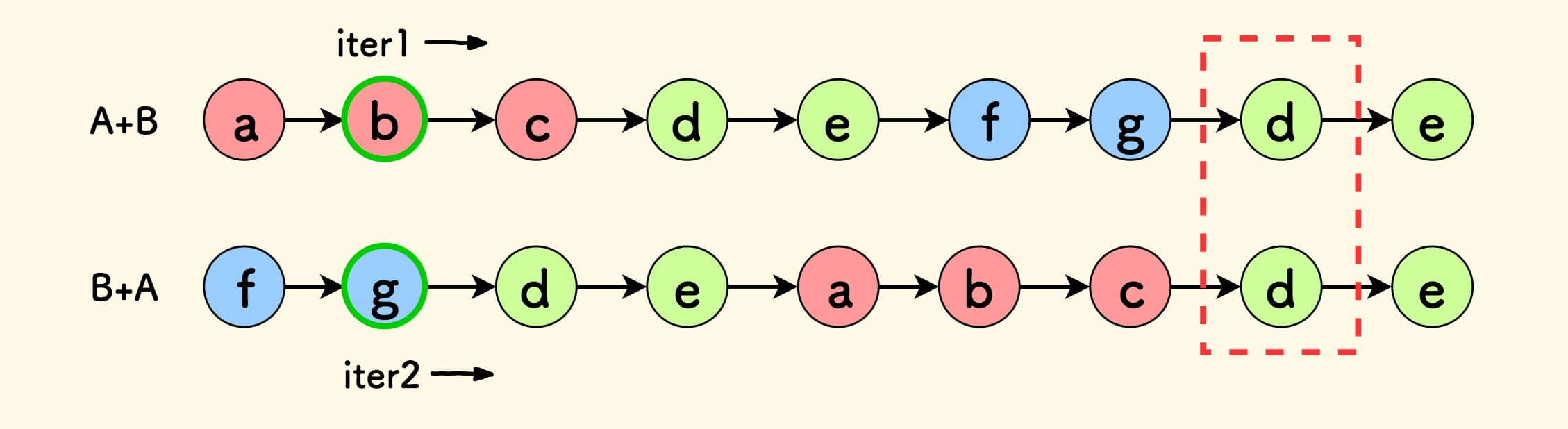 - 采用两个慢指针,一个从头出发,一个从相遇节点出发。