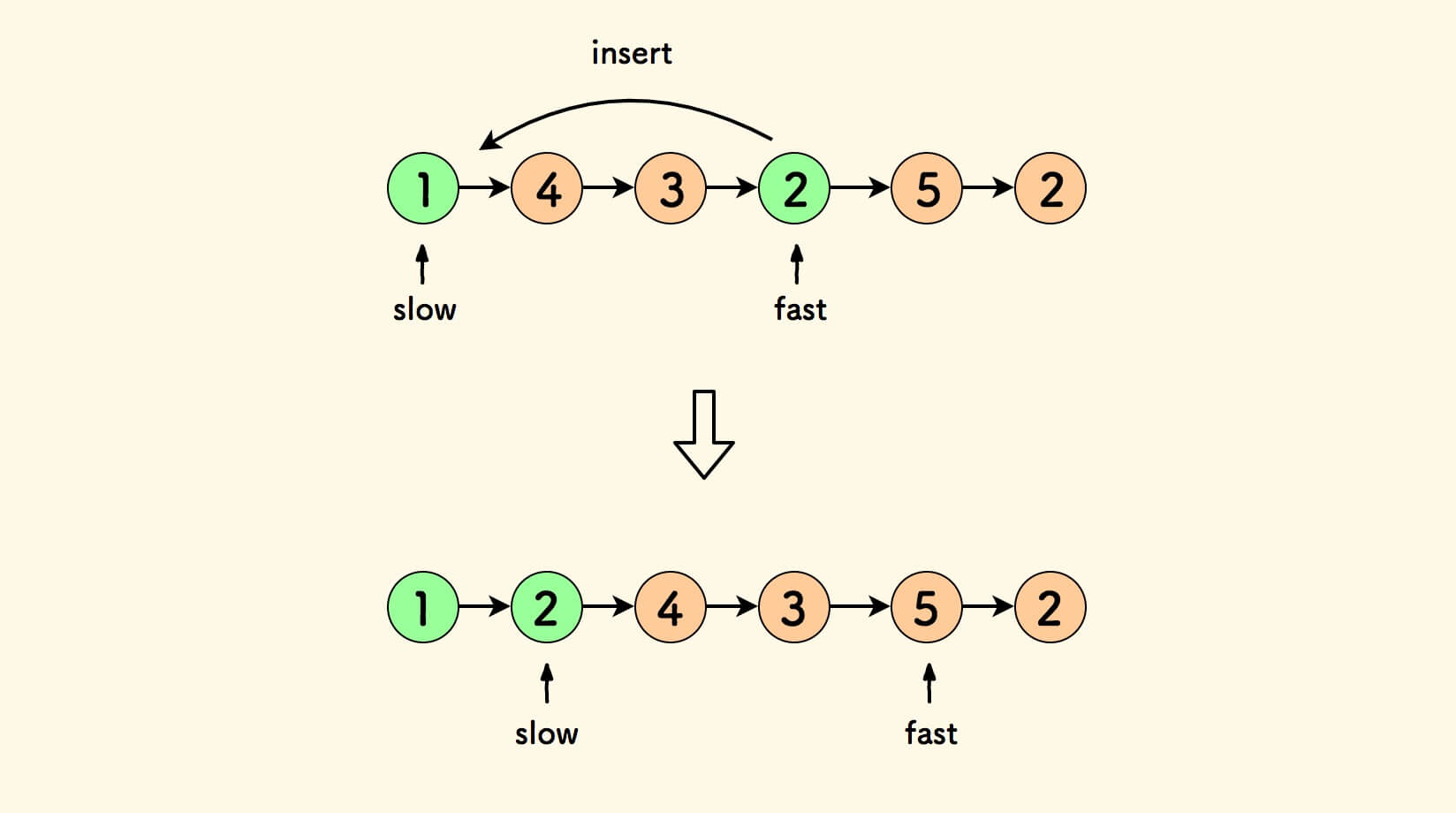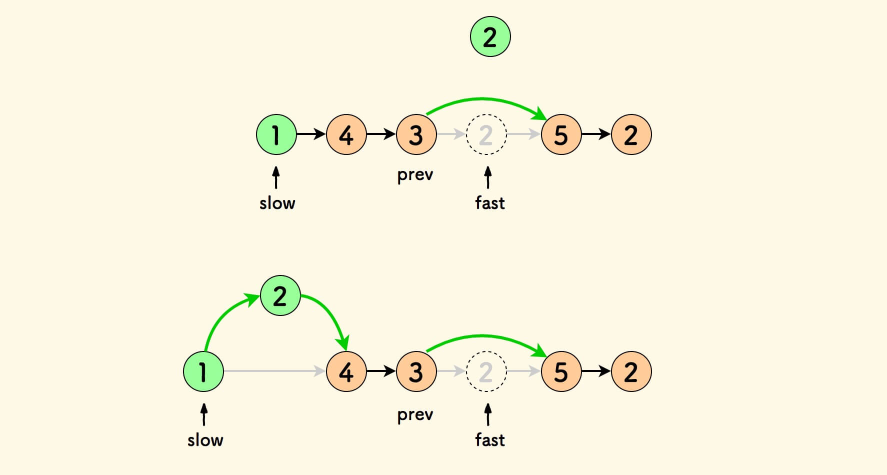 - 起两个指针迭代链表,一快一慢,快的一次走两步,慢的一次走一步。