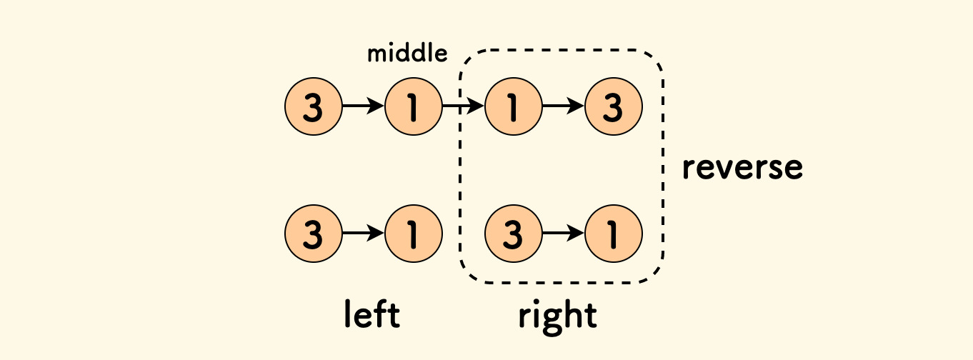 - 拷贝一份原链表,反转后和原链表进行比较。