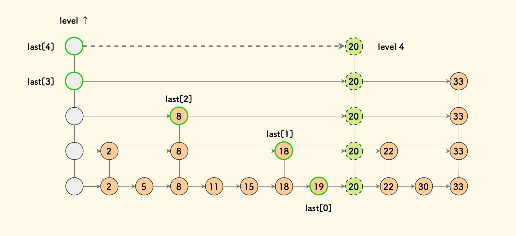 lastarray is the insertion position at each level, and next, the head node will point to the new node at these newly increased levels, the head nodeheadis recorded as the value of thelastarray at these levels.In the figure below, if a large order