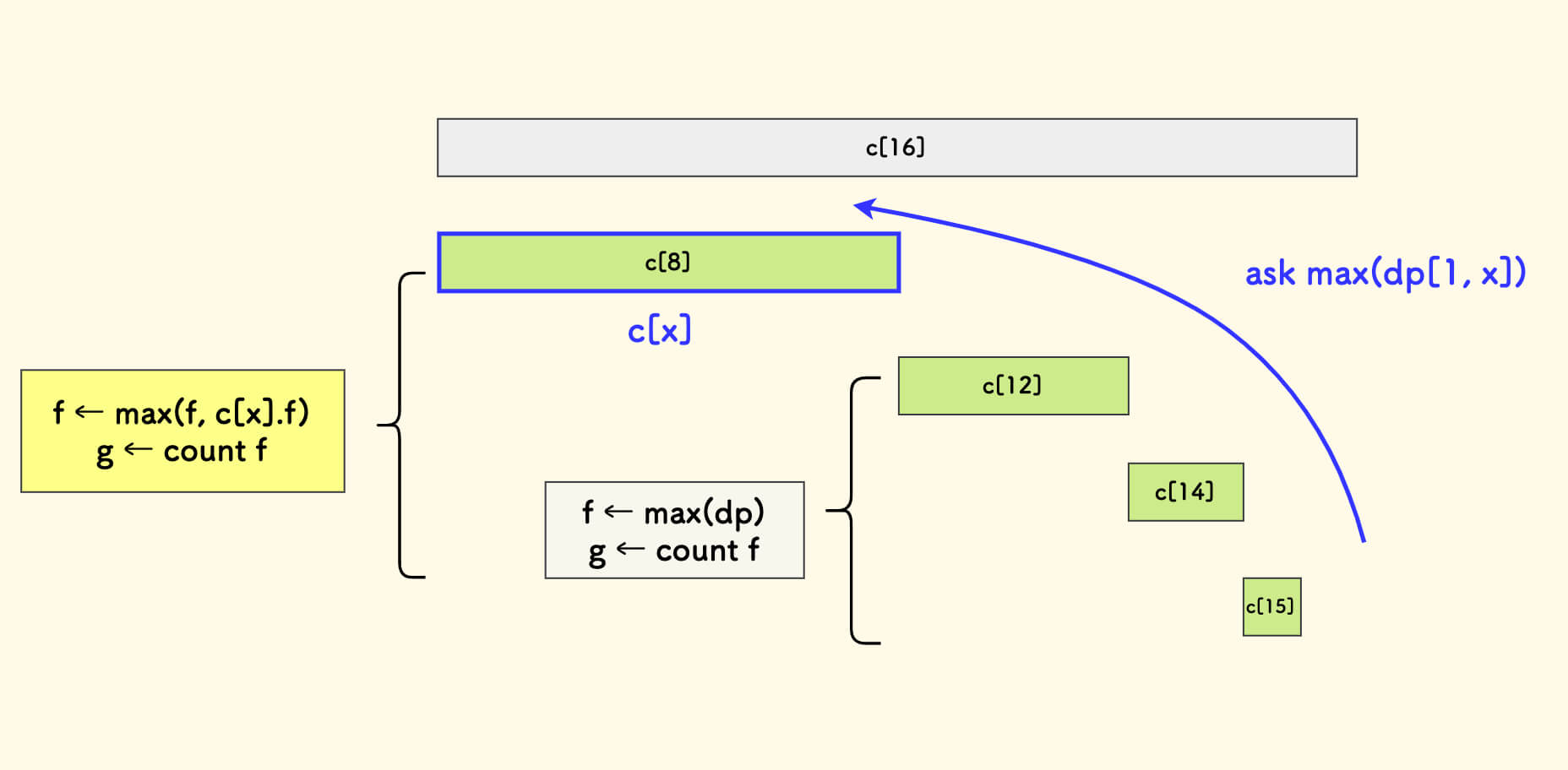 // f 和 g 分别表示 [1,x] 上的 LIS 长度 和 个数