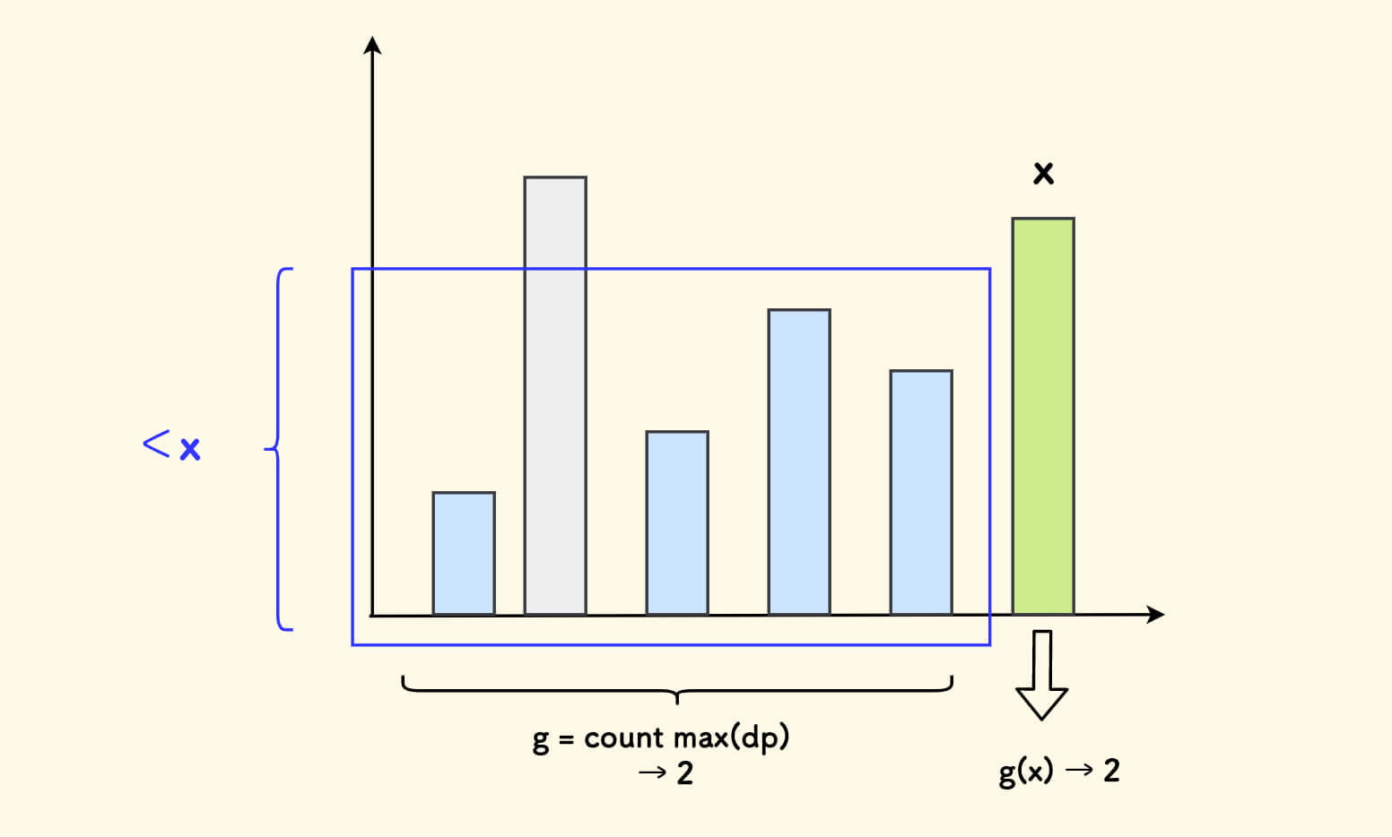 x的值结尾的 LIS 的长度是g的话,那么添加了更大的x后,LIS 的个数也是g。比如下图中例子,蓝色框表示值域