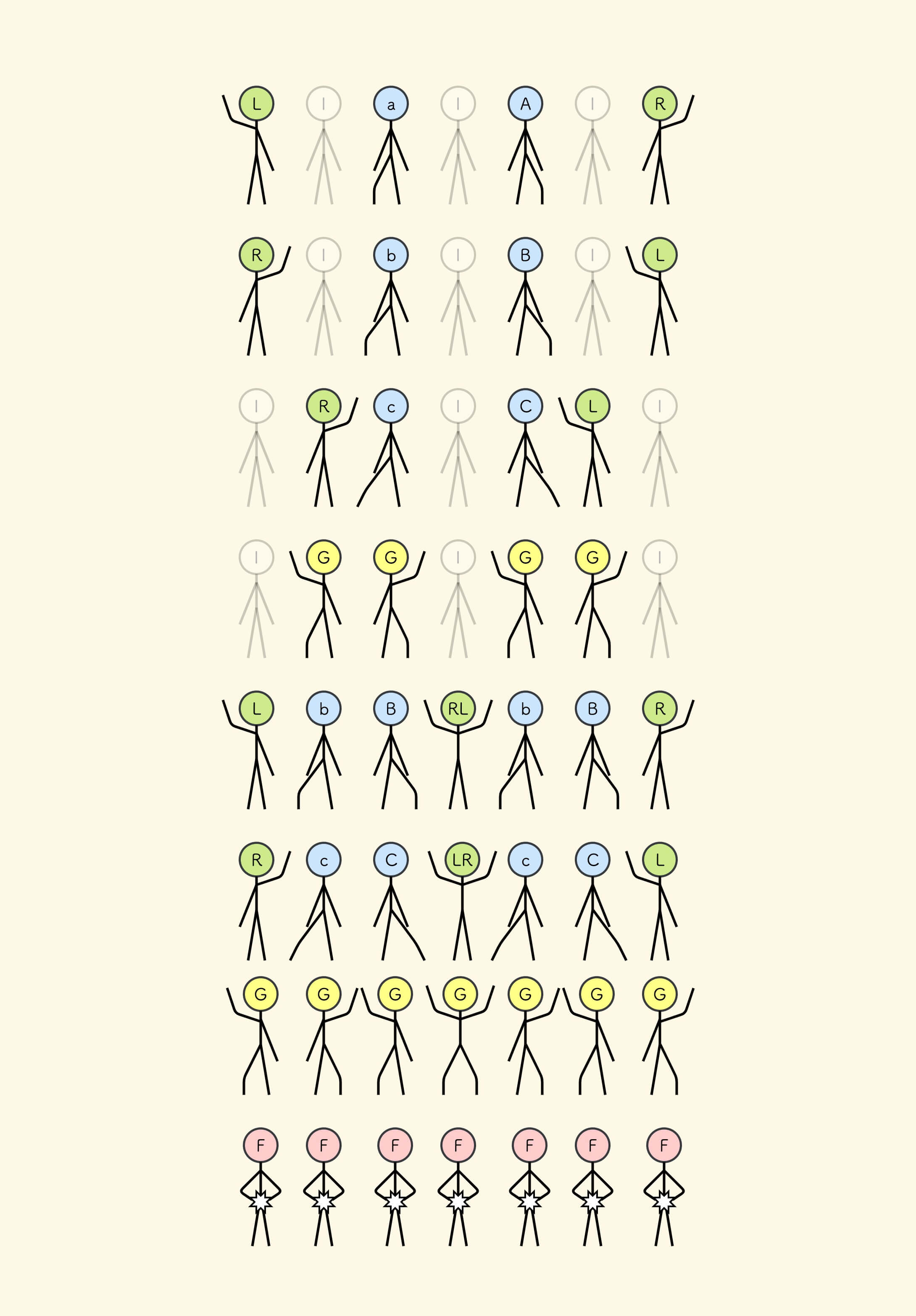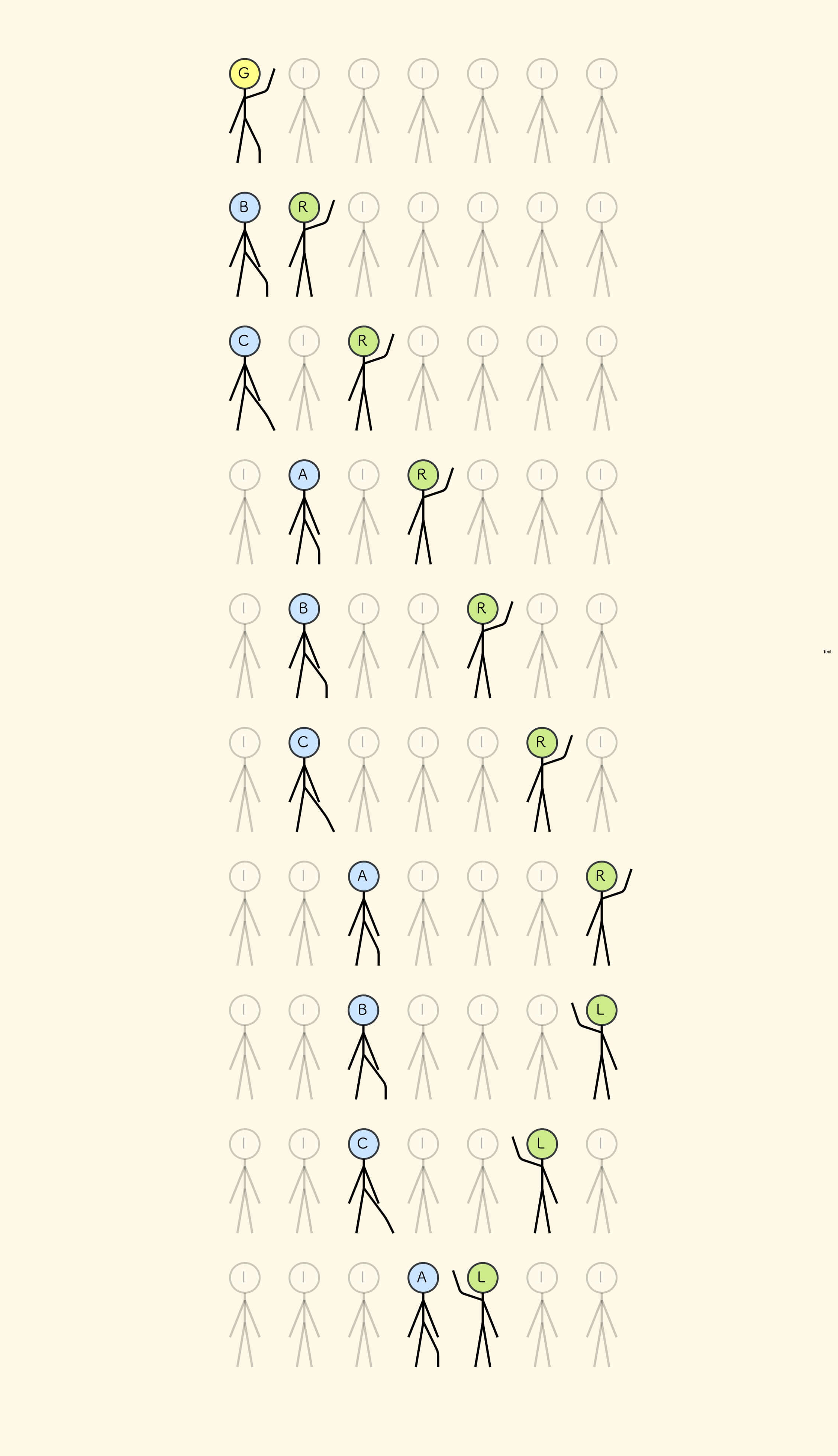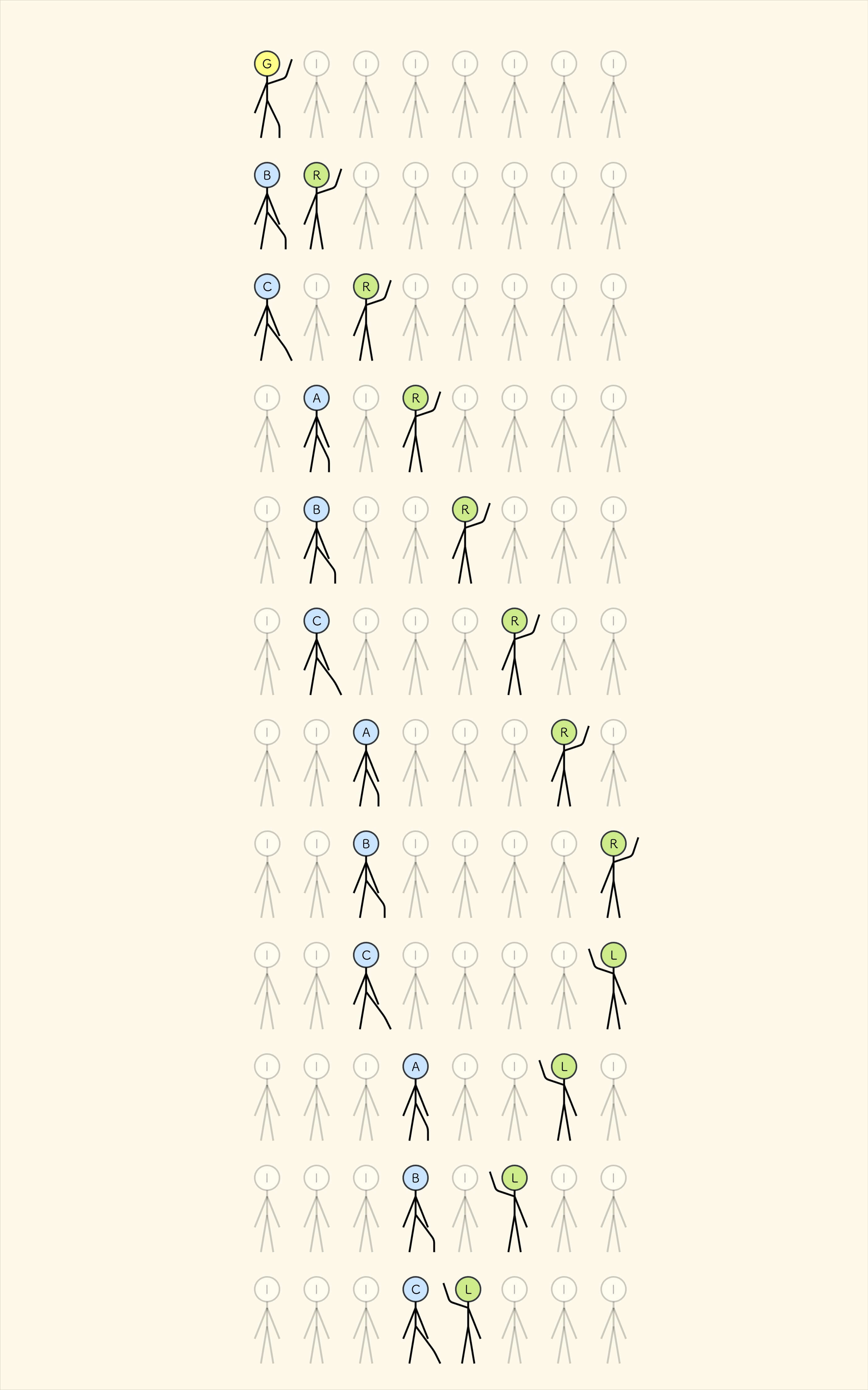 最开始的时候,让队头的士兵举右手、抬右腿,此时称他是一个将军 General,即处于 G