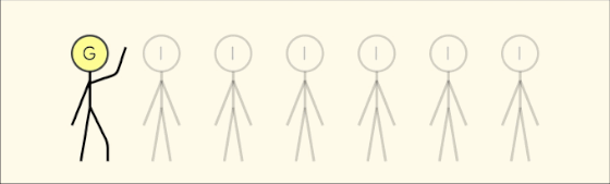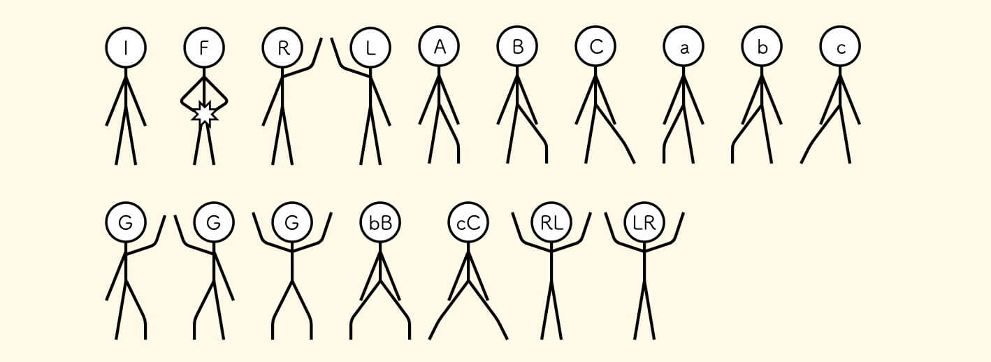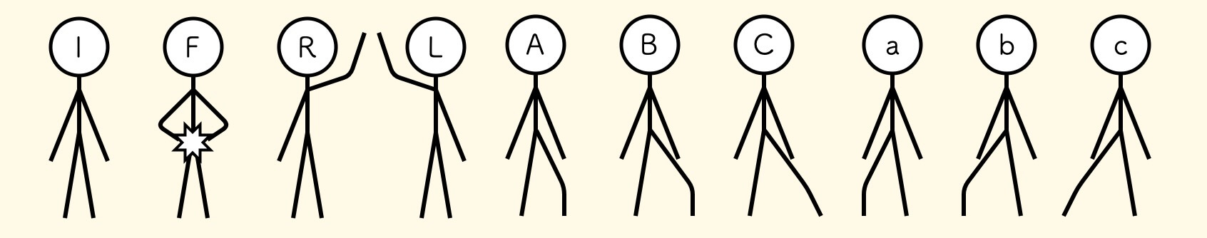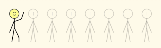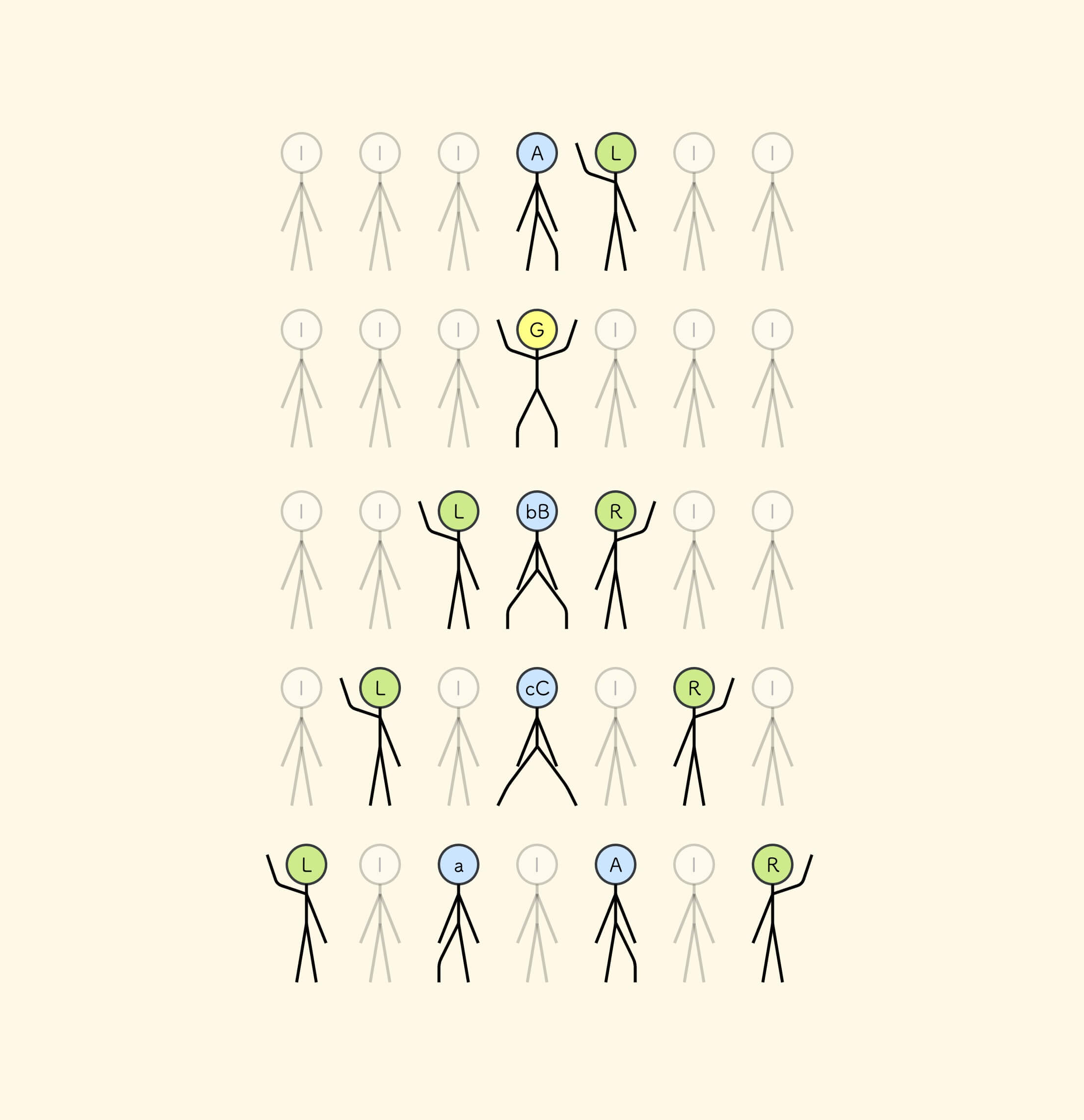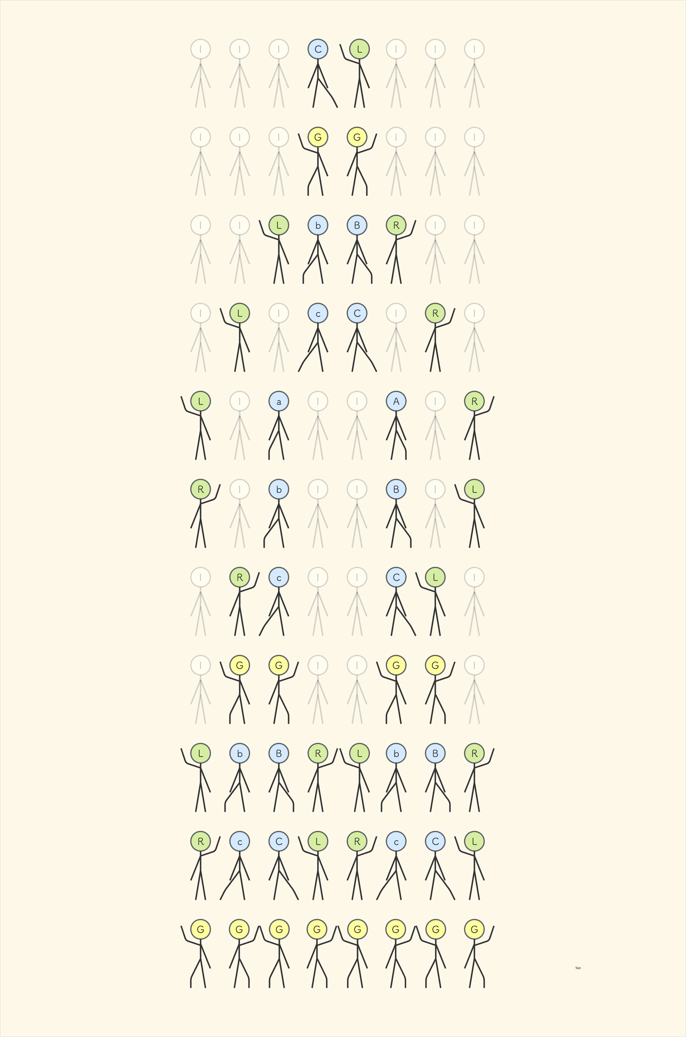 最开始的时候,让队头的士兵举右手、抬右腿,此时称他是一个将军 General,即处于 G